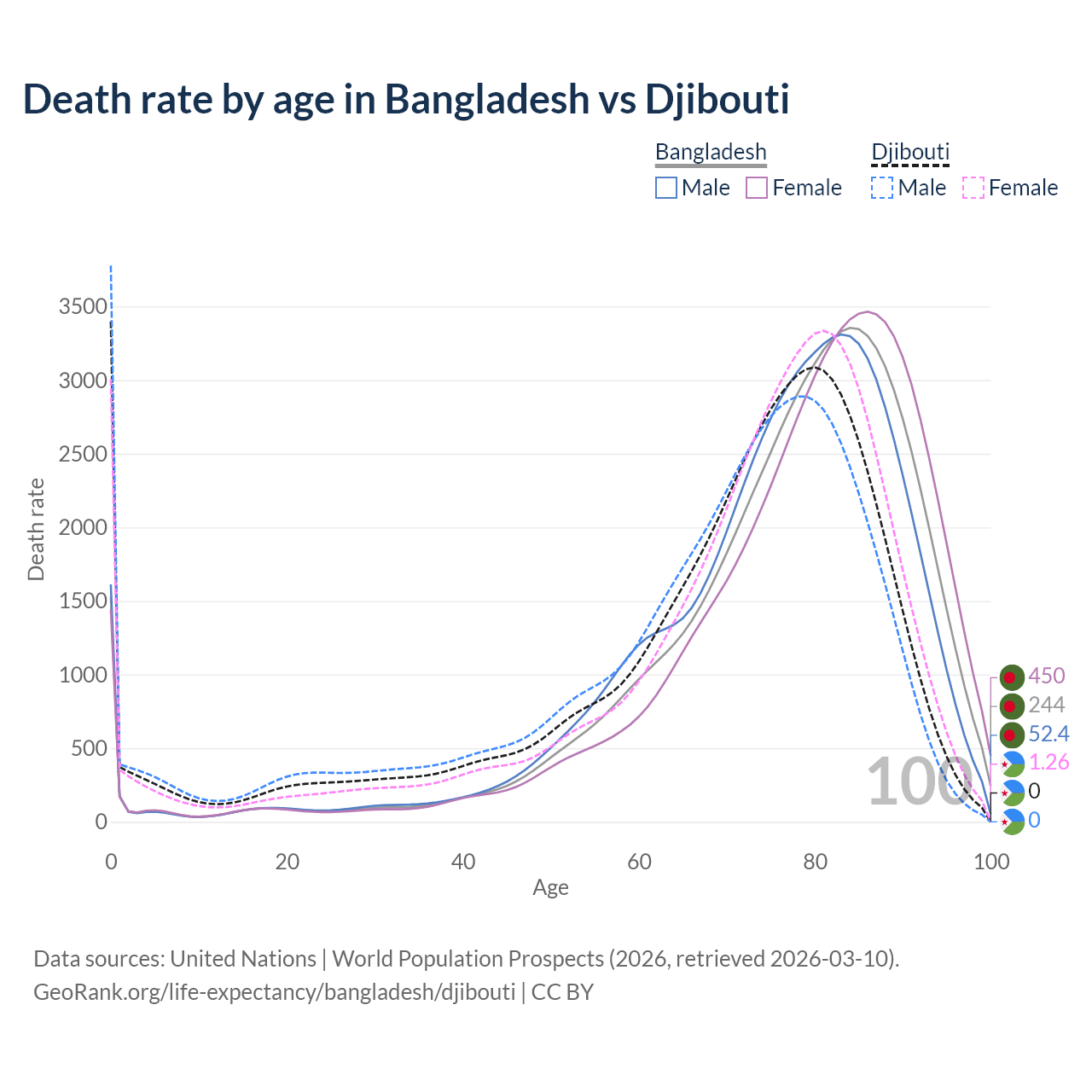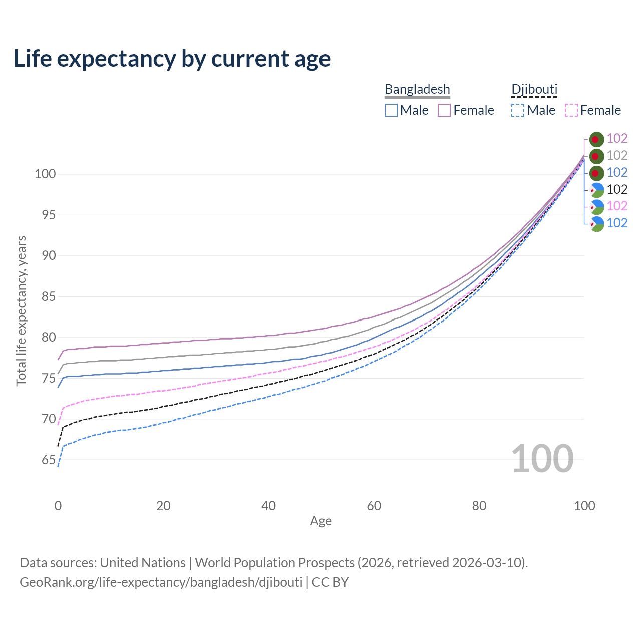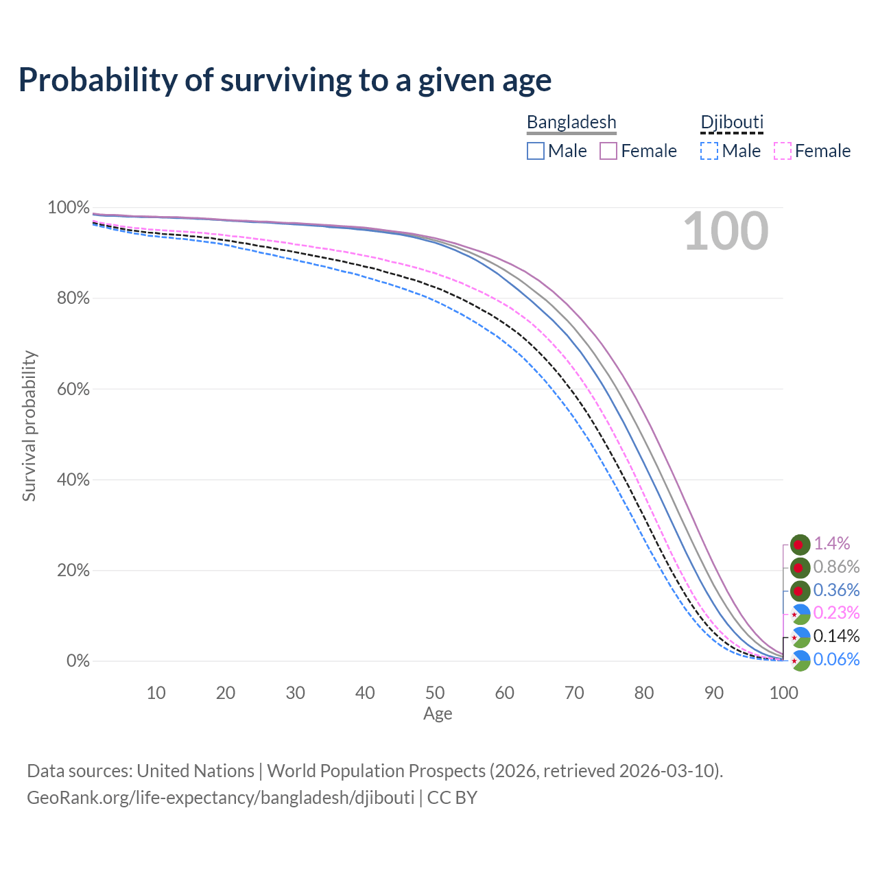 This life expectancy calculator shows the odds of living to 100, 95, 90, and below based on current age for both males and females in Bangladesh and Djibouti, along with mean and median age of death. The calculations are based on the 2026 life tables (actuarial tables) from the UN World Population Prospects.