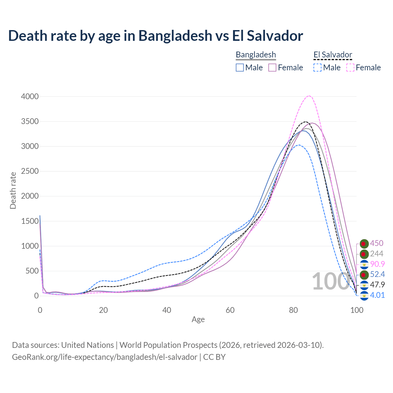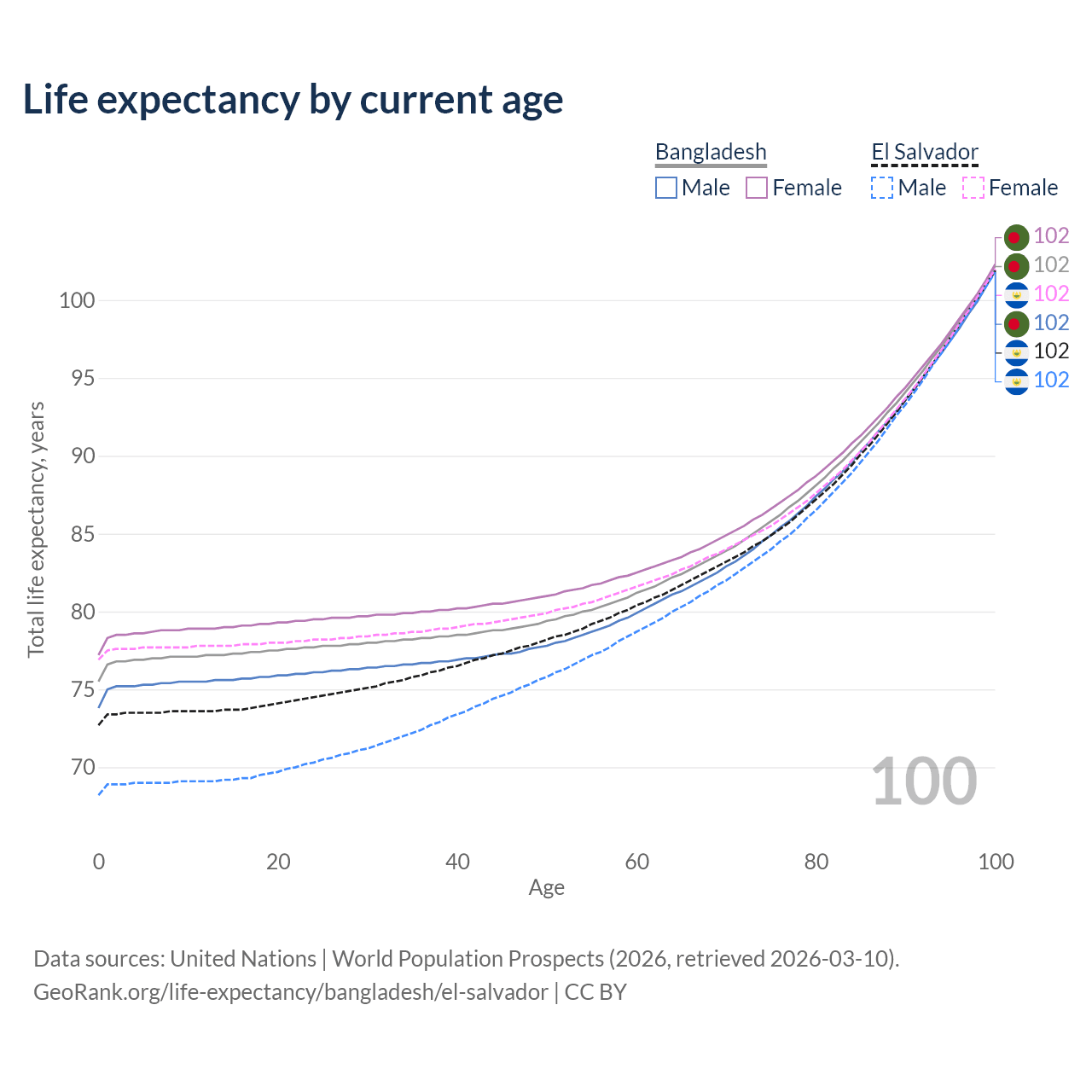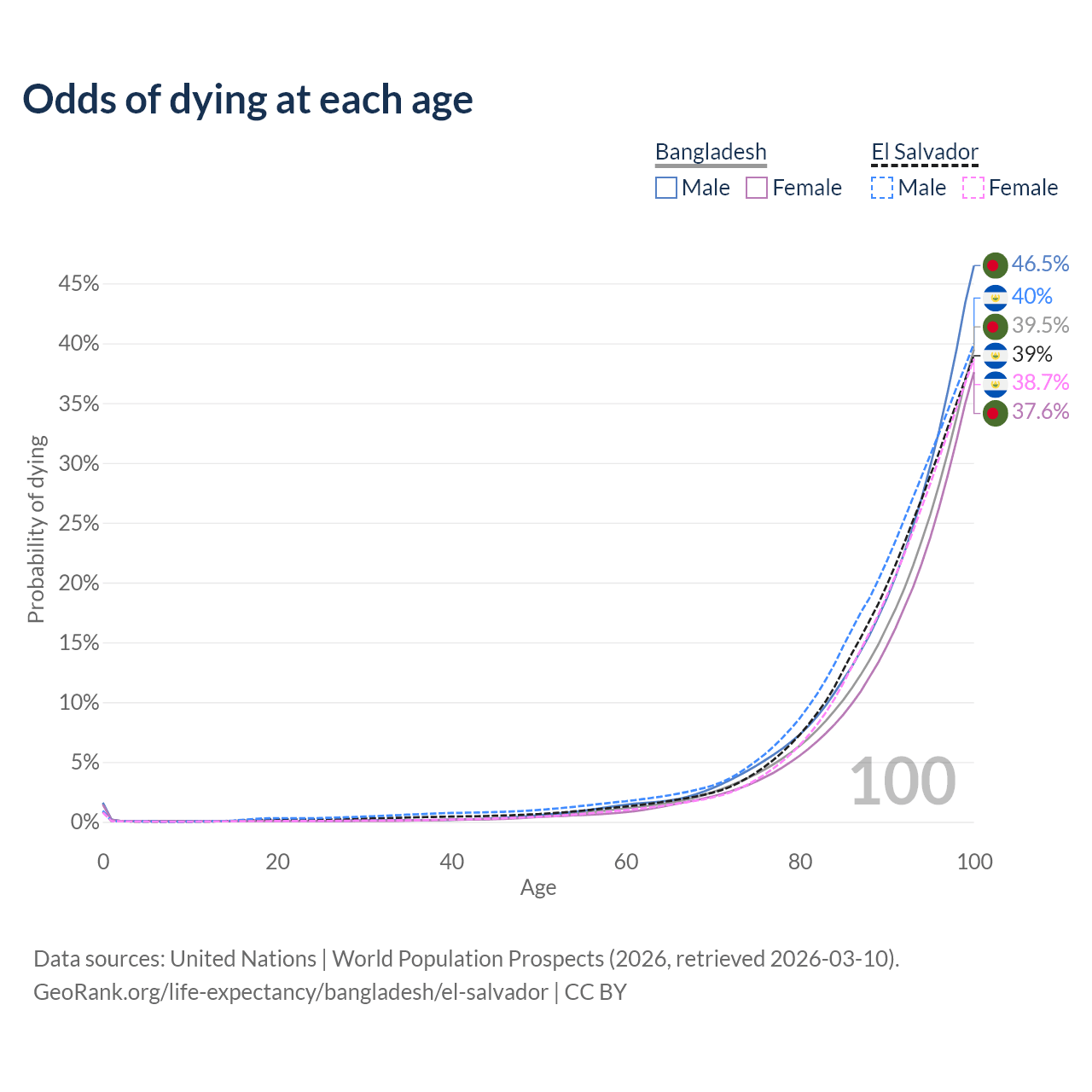 This life expectancy calculator shows the odds of living to 100, 95, 90, and below based on current age for both males and females in Bangladesh and El Salvador, along with mean and median age of death. The calculations are based on the 2026 life tables (actuarial tables) from the UN World Population Prospects.