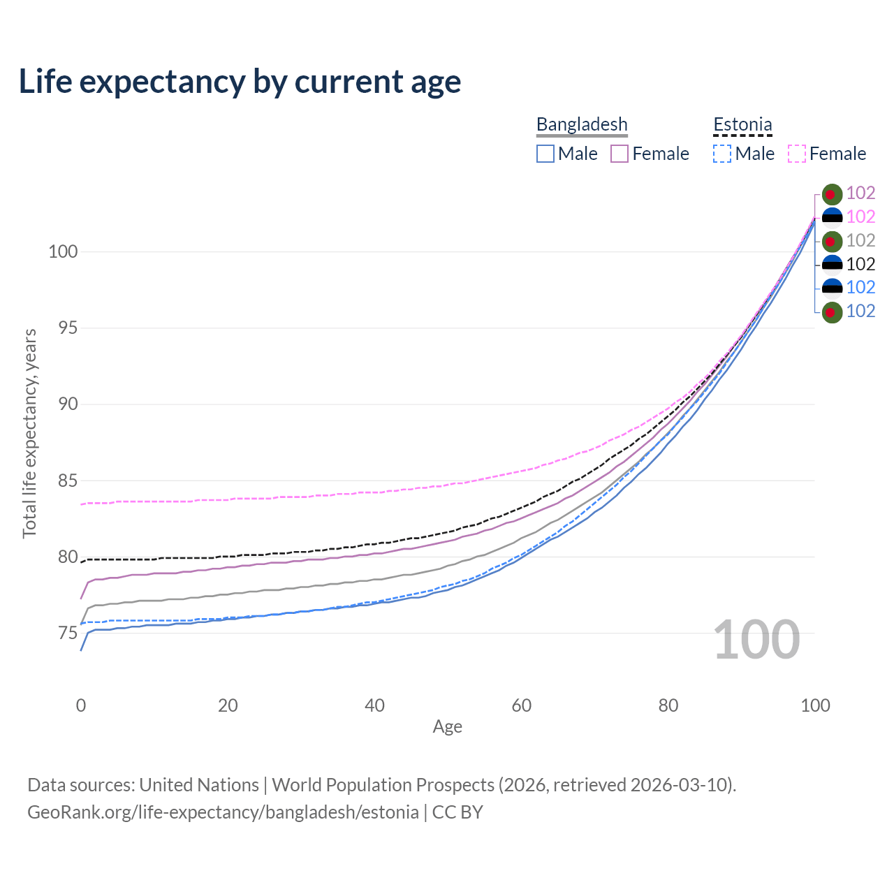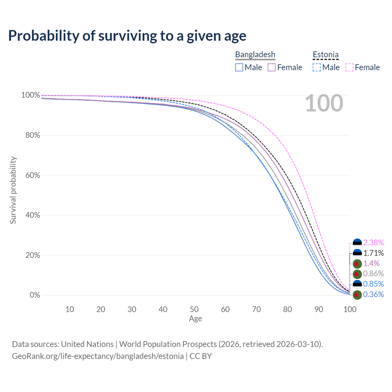 This life expectancy calculator shows the odds of living to 100, 95, 90, and below based on current age for both males and females in Bangladesh and Estonia, along with mean and median age of death. The calculations are based on the 2026 life tables (actuarial tables) from the UN World Population Prospects.