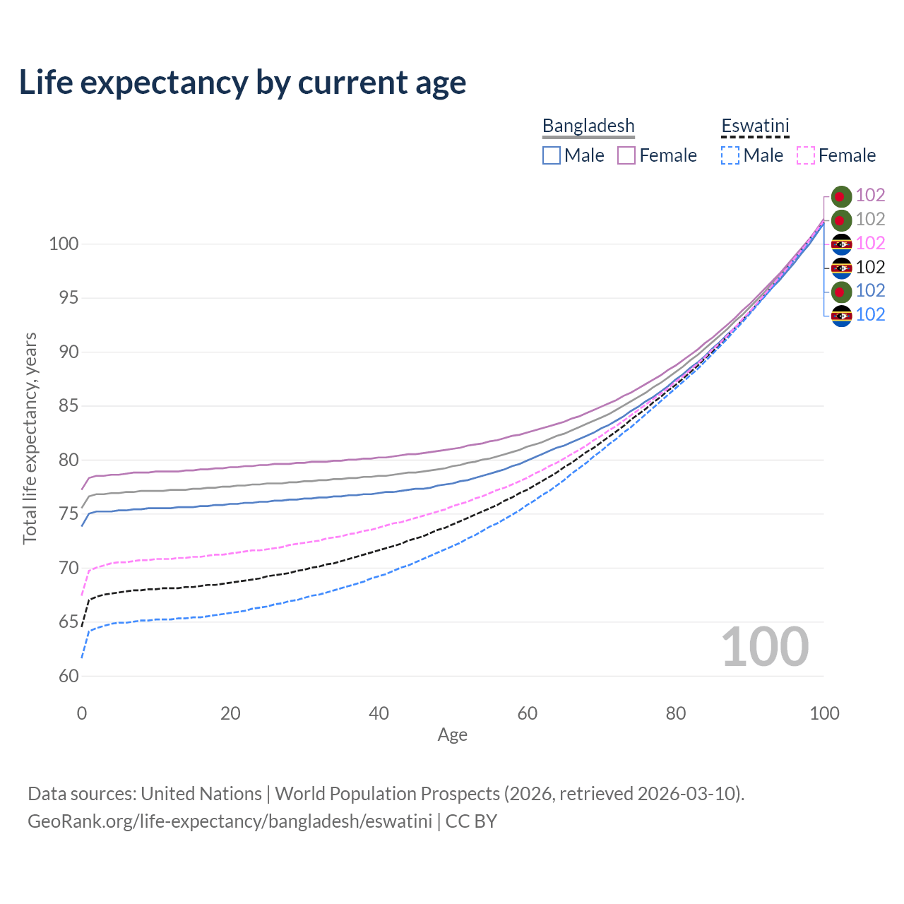 This life expectancy calculator shows the odds of living to 100, 95, 90, and below based on current age for both males and females in Bangladesh and Eswatini, along with mean and median age of death. The calculations are based on the 2026 life tables (actuarial tables) from the UN World Population Prospects.