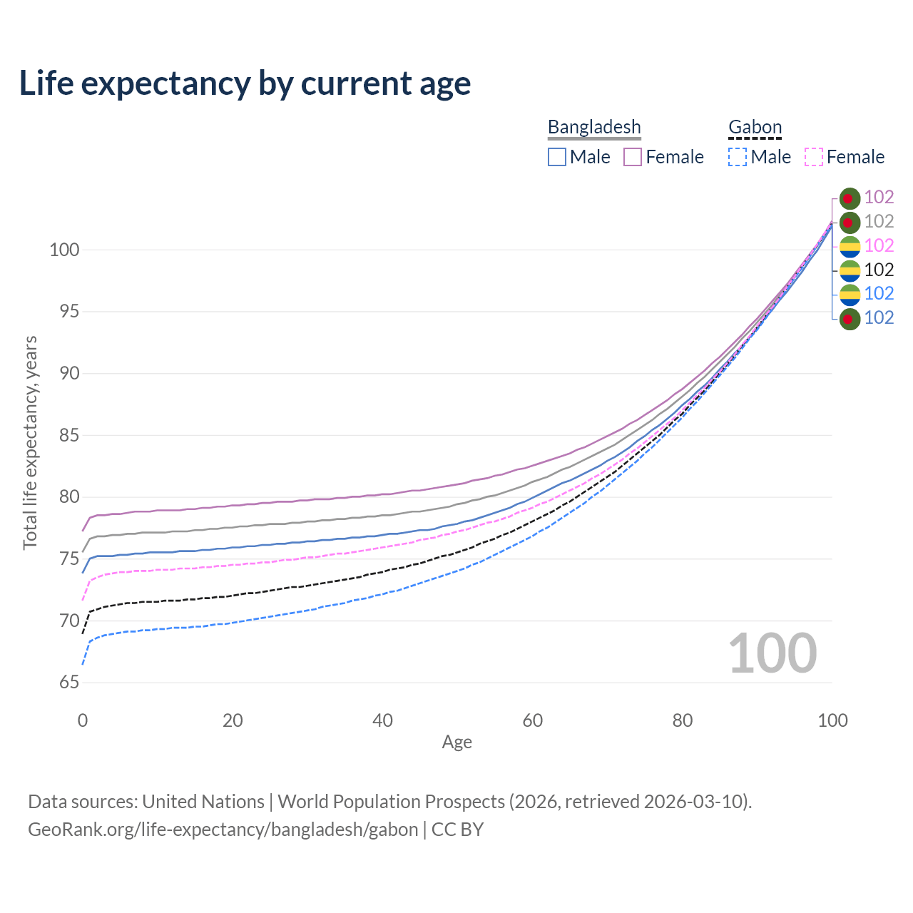 This life expectancy calculator shows the odds of living to 100, 95, 90, and below based on current age for both males and females in Bangladesh and Gabon, along with mean and median age of death. The calculations are based on the 2026 life tables (actuarial tables) from the UN World Population Prospects.