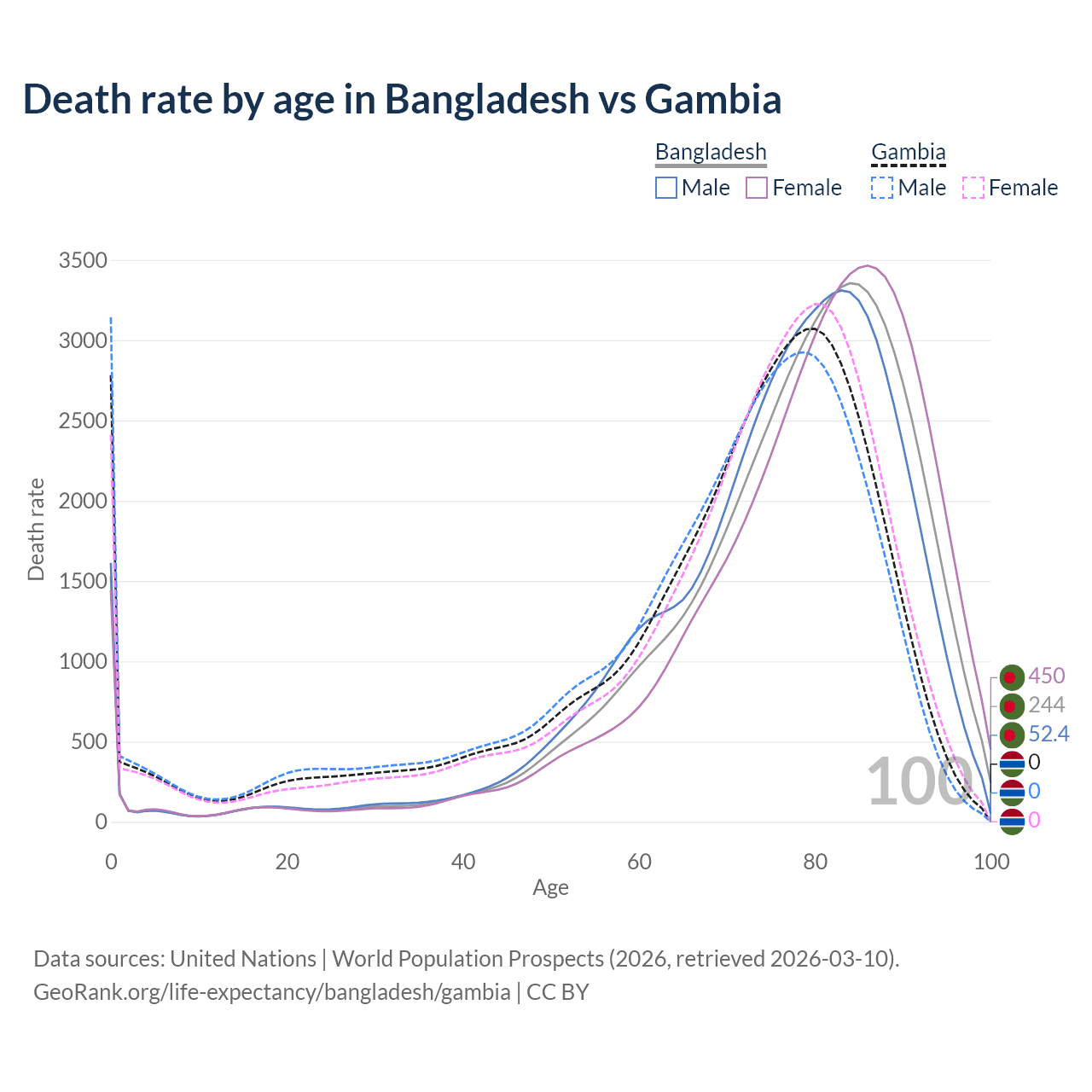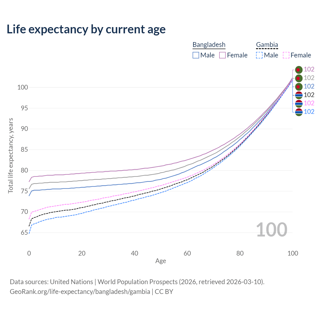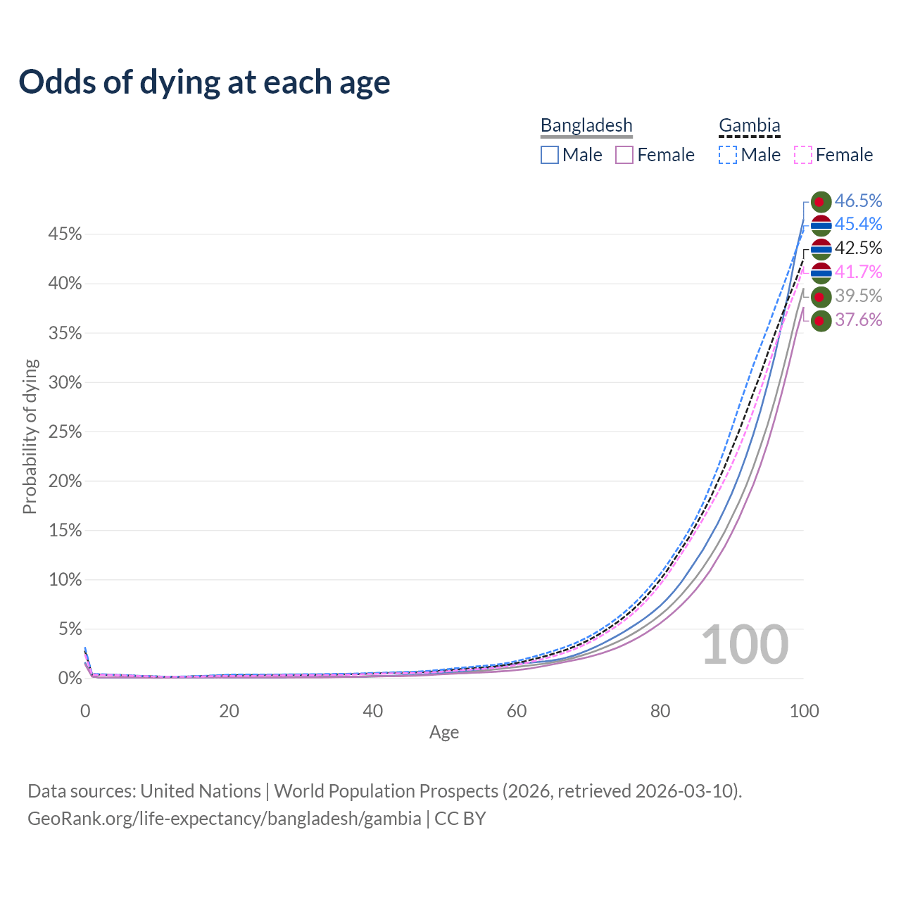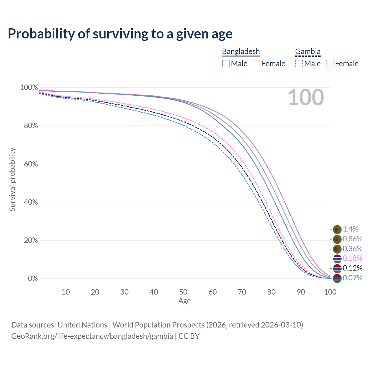This life expectancy calculator shows the odds of living to 100, 95, 90, and below based on current age for both males and females in Bangladesh and the Gambia, along with mean and median age of death. The calculations are based on the 2026 life tables (actuarial tables) from the UN World Population Prospects.