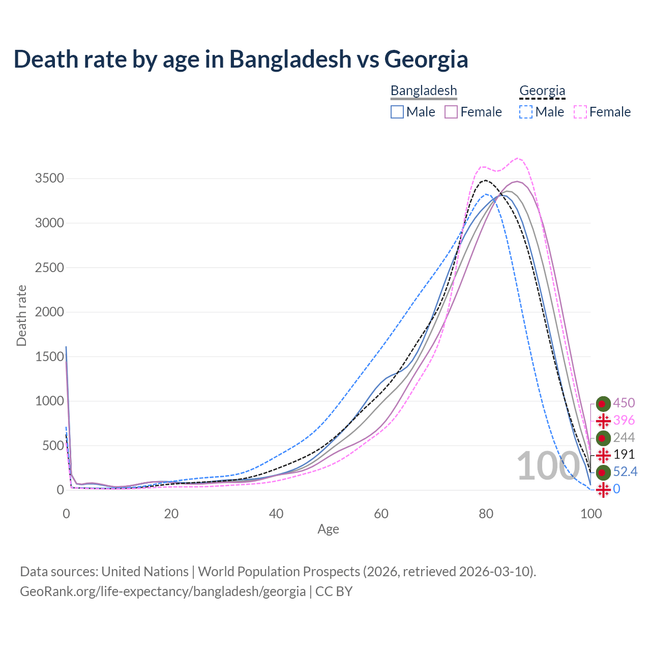 This life expectancy calculator shows the odds of living to 100, 95, 90, and below based on current age for both males and females in Bangladesh and Georgia, along with mean and median age of death. The calculations are based on the 2026 life tables (actuarial tables) from the UN World Population Prospects.