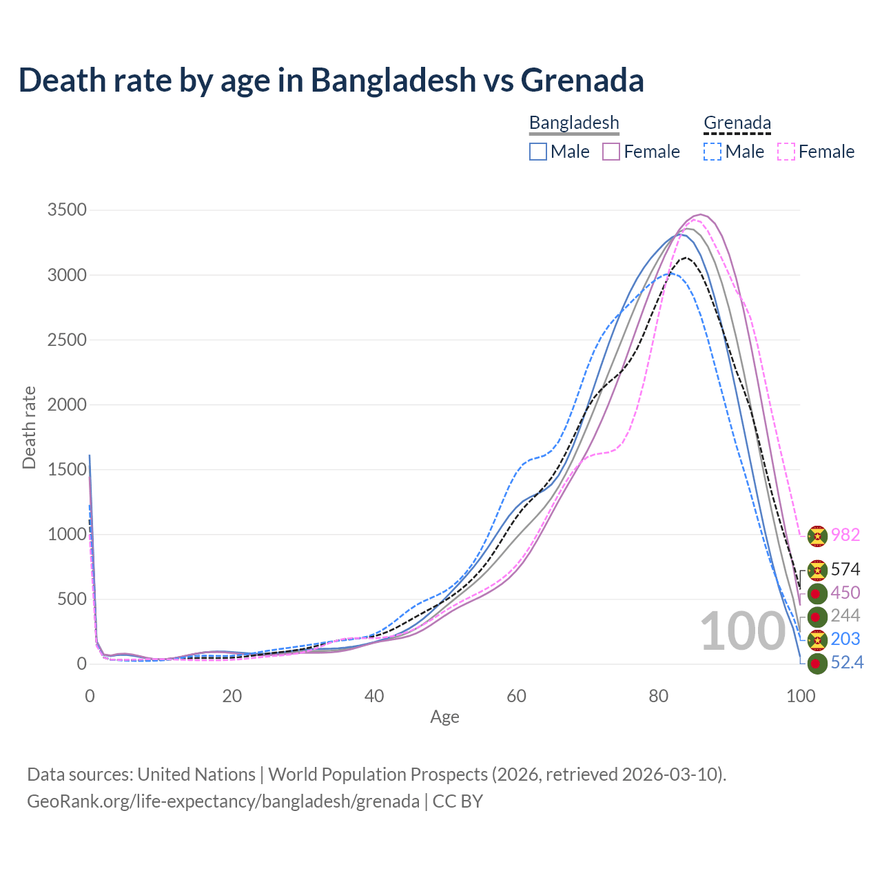 In Bangladesh, the most common age of death is 84, compared to 84 in Grenada. The median age of death is 79.7 in Bangladesh and 79.3 in Grenada, meaning only half of each cohort is expected to live past that age.