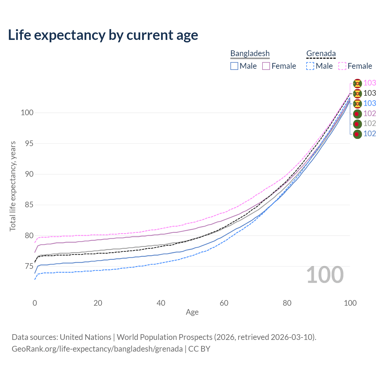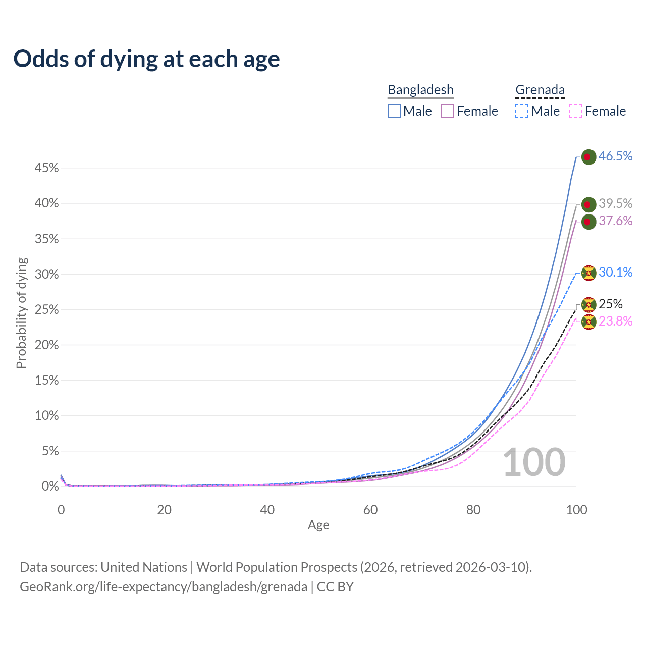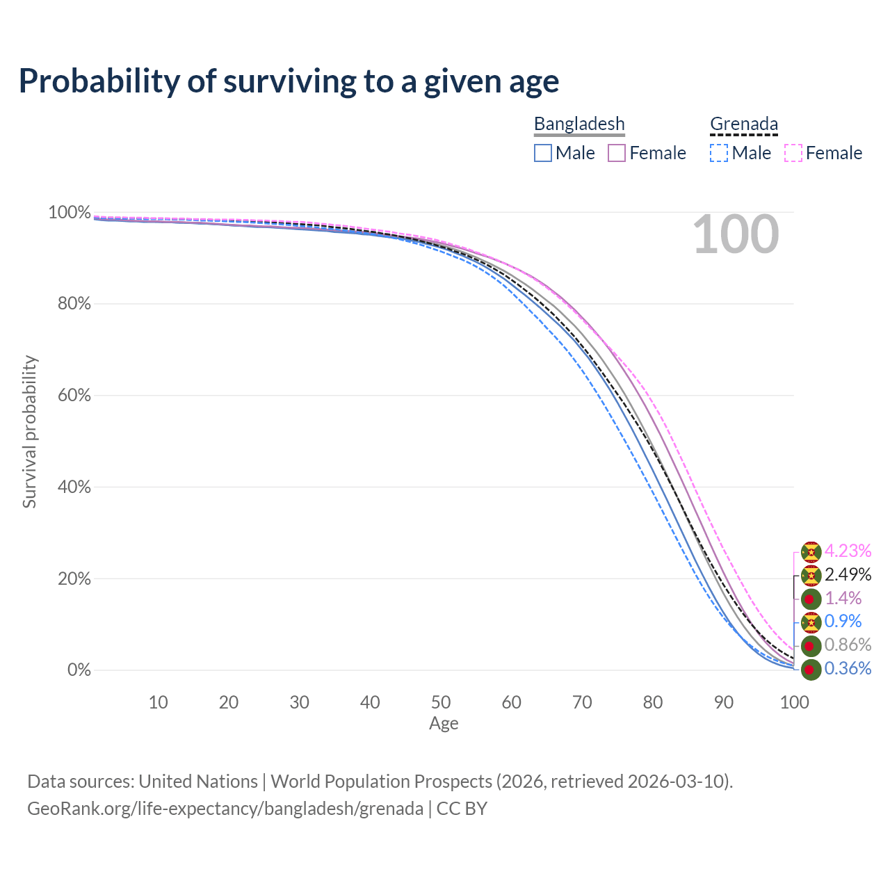 This life expectancy calculator shows the odds of living to 100, 95, 90, and below based on current age for both males and females in Bangladesh and Grenada, along with mean and median age of death. The calculations are based on the 2026 life tables (actuarial tables) from the UN World Population Prospects.