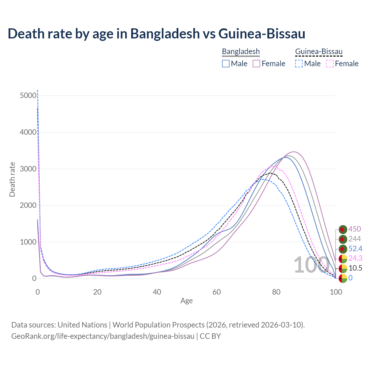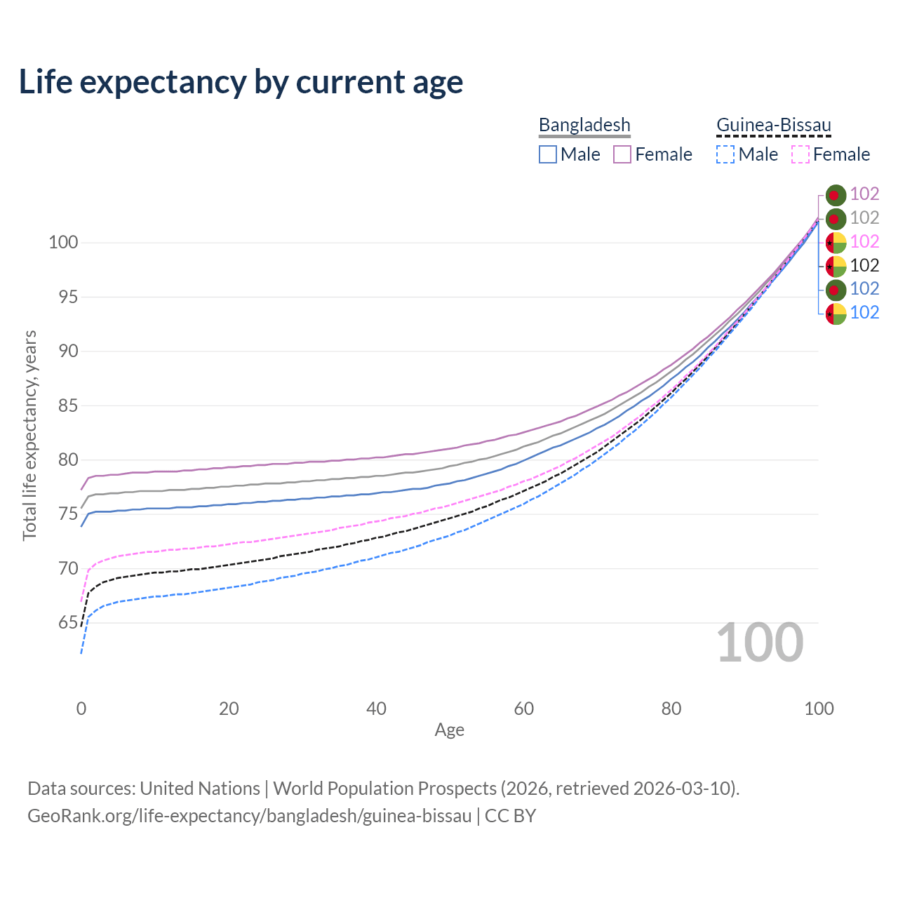 This life expectancy calculator shows the odds of living to 100, 95, 90, and below based on current age for both males and females in Bangladesh and Guinea-Bissau, along with mean and median age of death. The calculations are based on the 2026 life tables (actuarial tables) from the UN World Population Prospects.