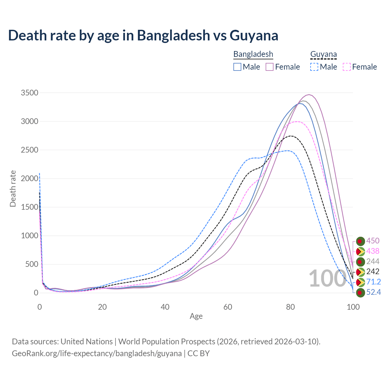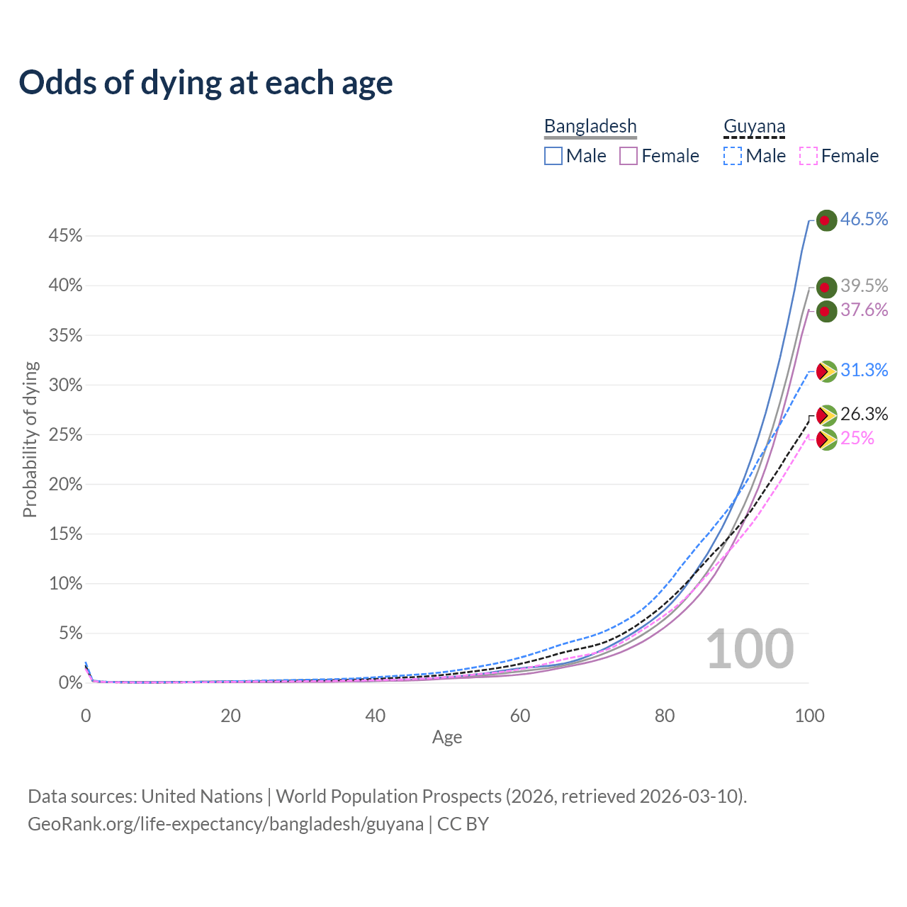 This life expectancy calculator shows the odds of living to 100, 95, 90, and below based on current age for both males and females in Bangladesh and Guyana, along with mean and median age of death. The calculations are based on the 2026 life tables (actuarial tables) from the UN World Population Prospects.