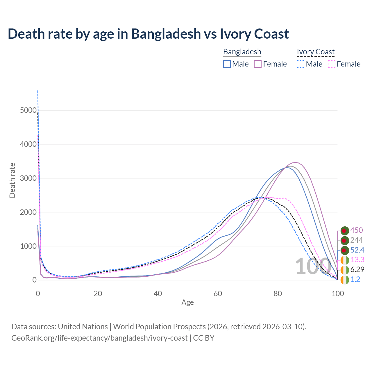 In Bangladesh, the most common age of death is 84, compared to 0 in Ivory Coast. The median age of death is 79.7 in Bangladesh and 68.6 in Ivory Coast, meaning only half of each cohort is expected to live past that age.