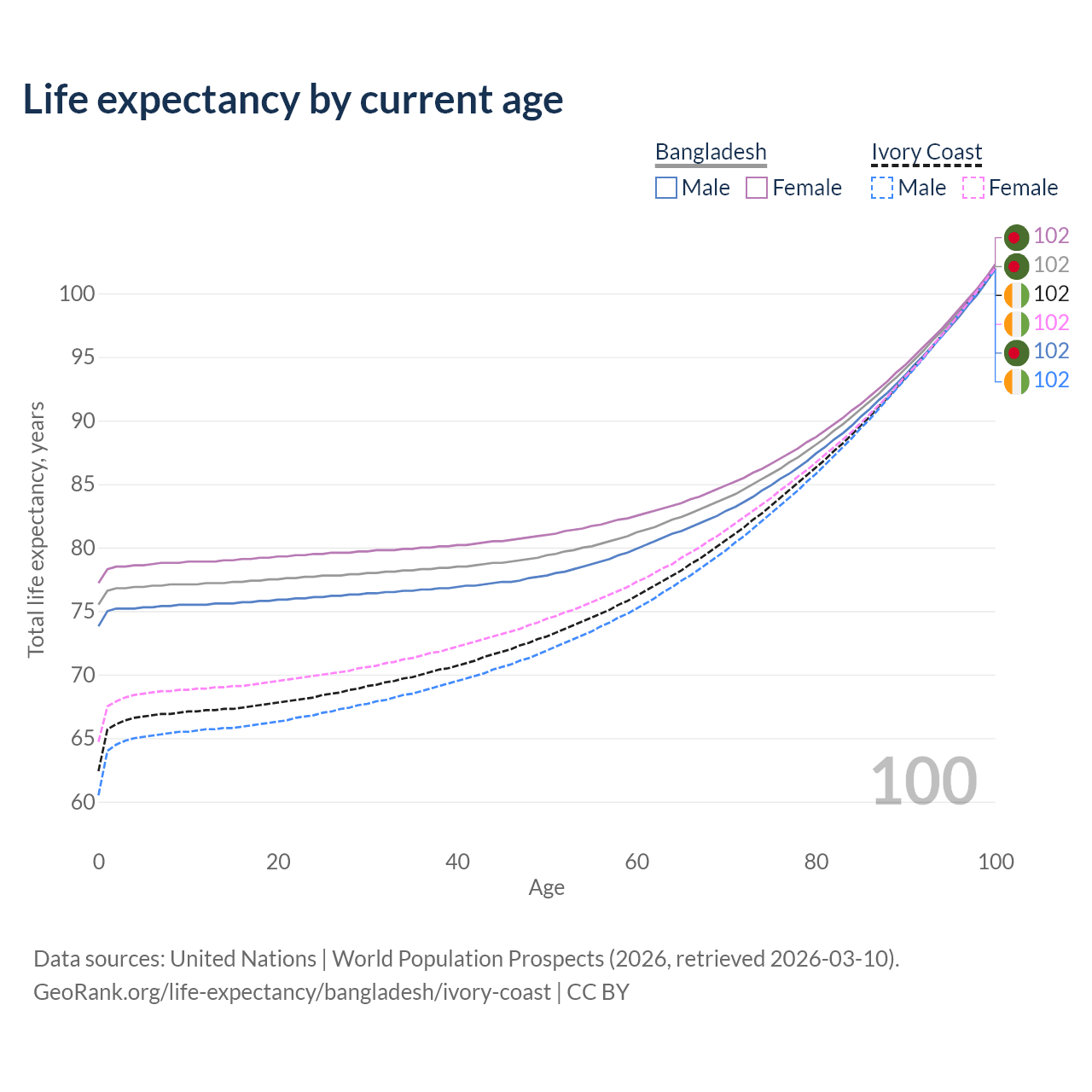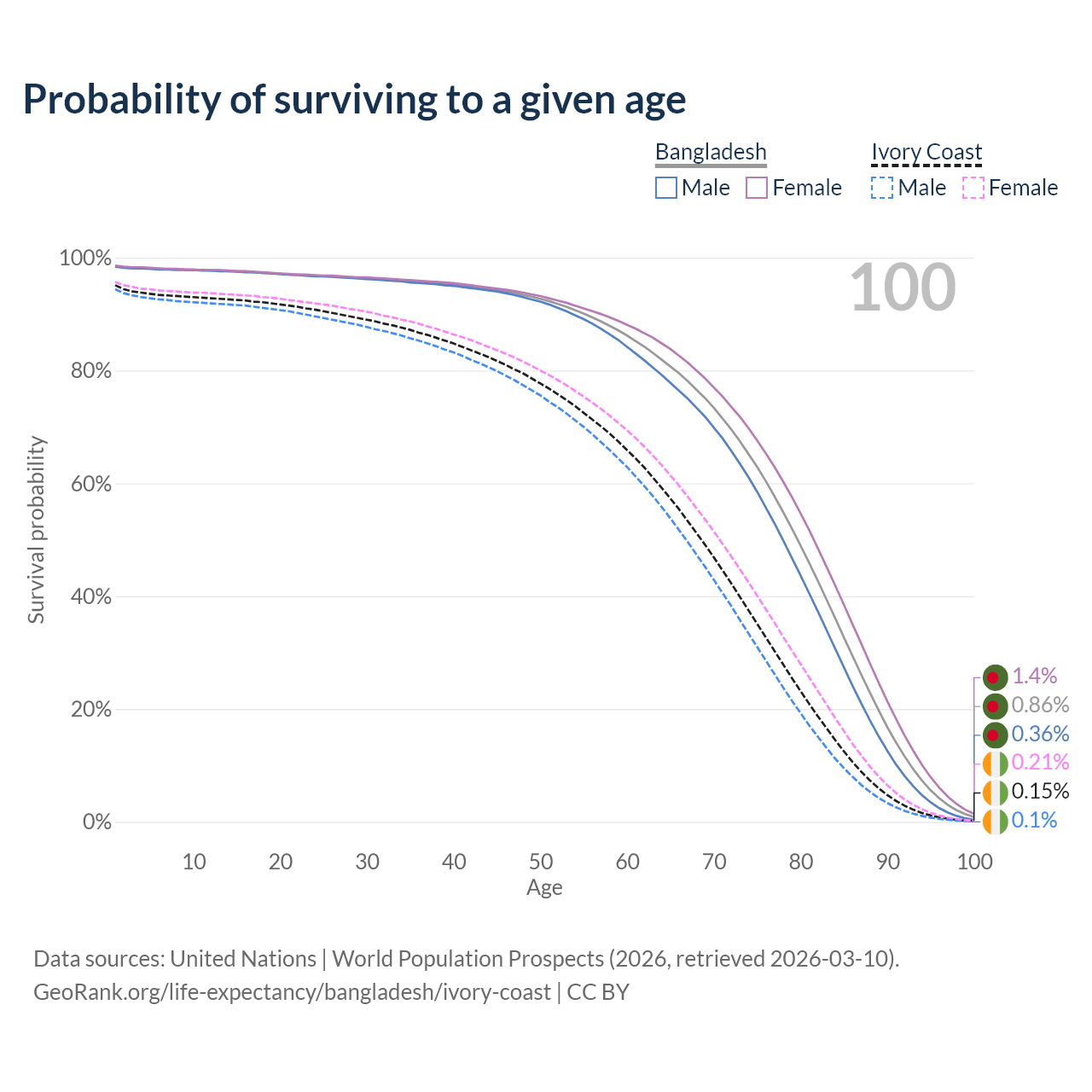 This life expectancy calculator shows the odds of living to 100, 95, 90, and below based on current age for both males and females in Bangladesh and Ivory Coast, along with mean and median age of death. The calculations are based on the 2026 life tables (actuarial tables) from the UN World Population Prospects.