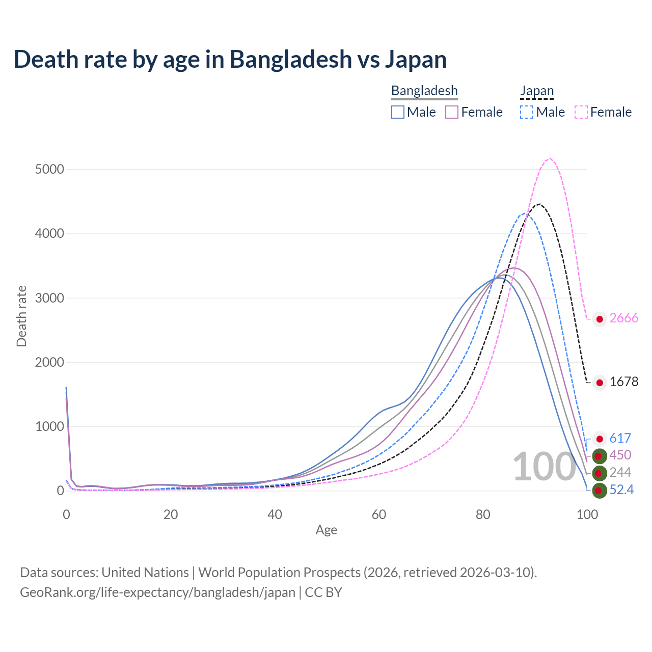 In Bangladesh, the most common age of death is 84, compared to 91 in Japan. The median age of death is 79.7 in Bangladesh and 88.1 in Japan, meaning only half of each cohort is expected to live past that age.