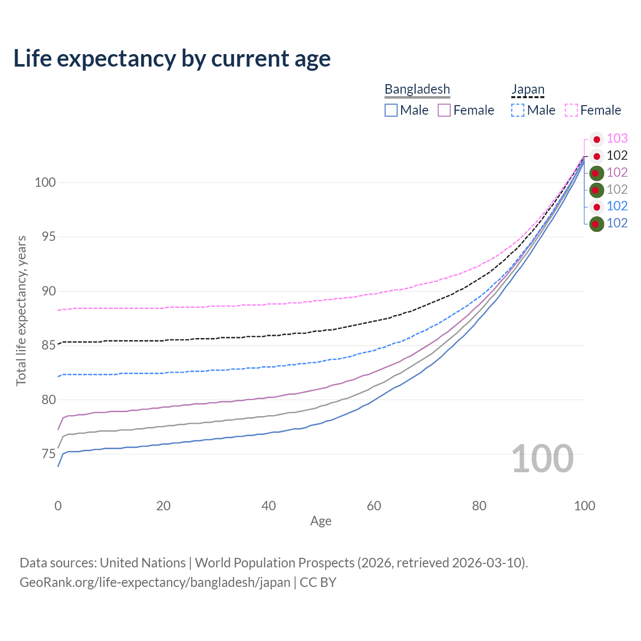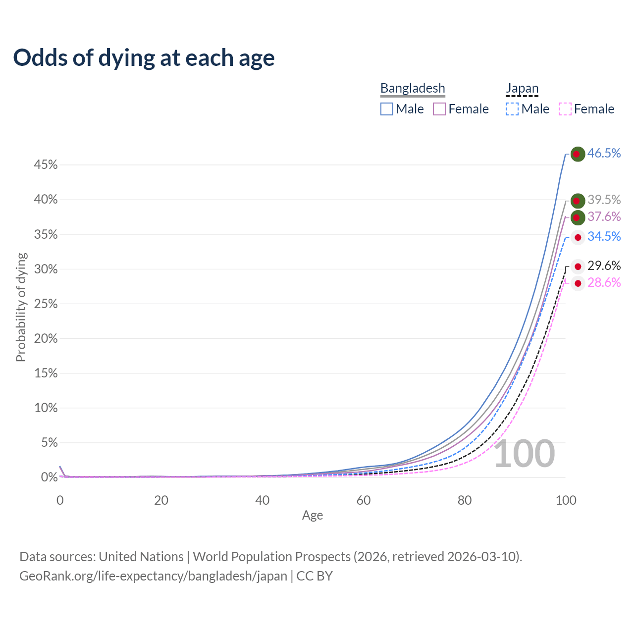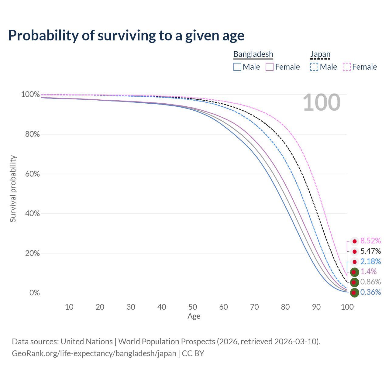 This life expectancy calculator shows the odds of living to 100, 95, 90, and below based on current age for both males and females in Bangladesh and Japan, along with mean and median age of death. The calculations are based on the 2026 life tables (actuarial tables) from the UN World Population Prospects.