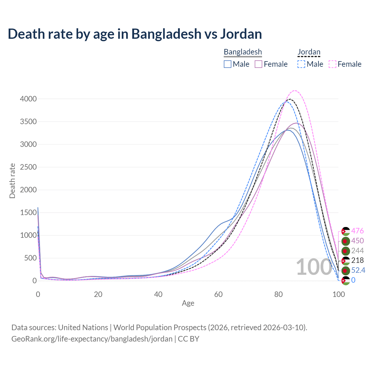In Bangladesh, the most common age of death is 84, compared to 84 in Jordan. The median age of death is 79.7 in Bangladesh and 81.3 in Jordan, meaning only half of each cohort is expected to live past that age.