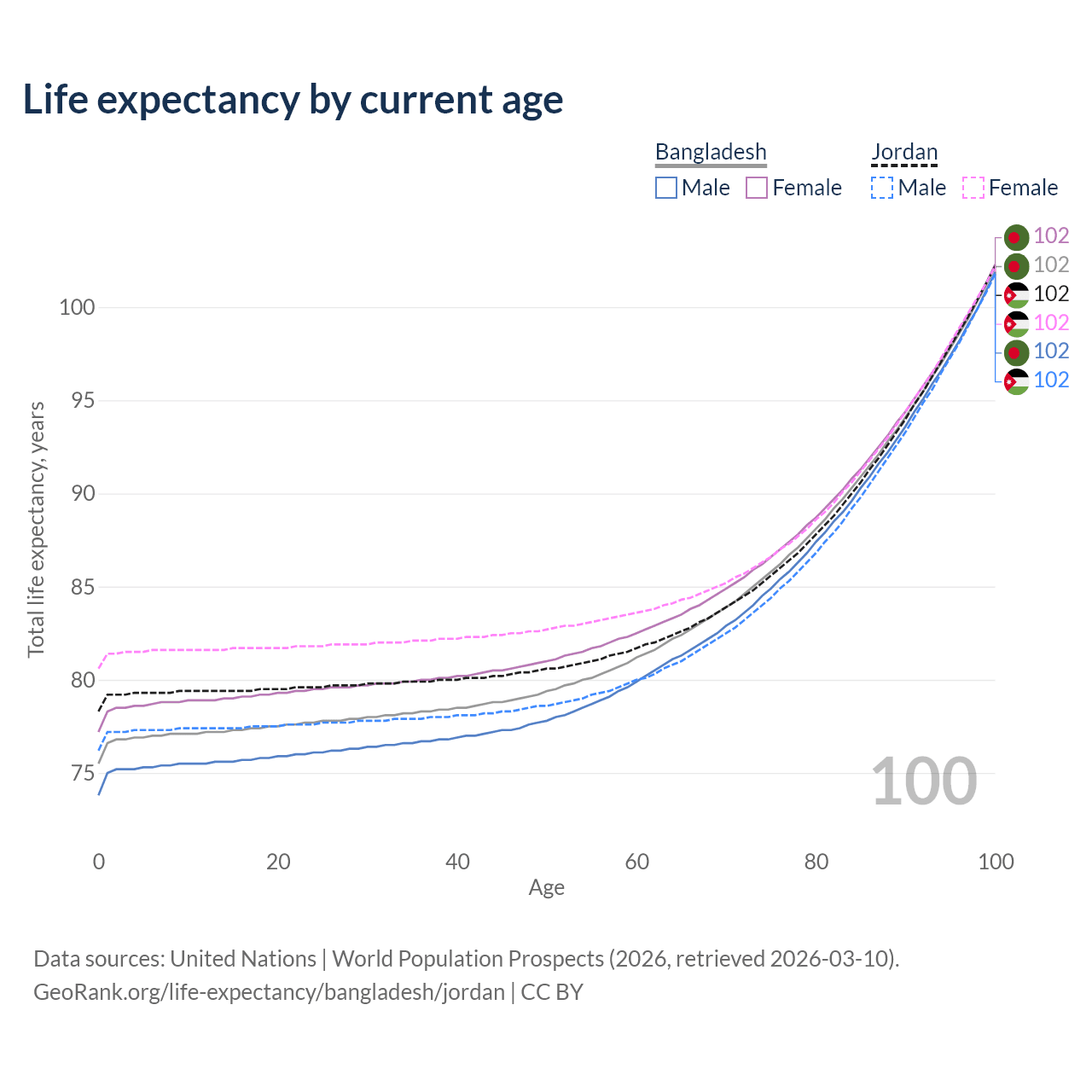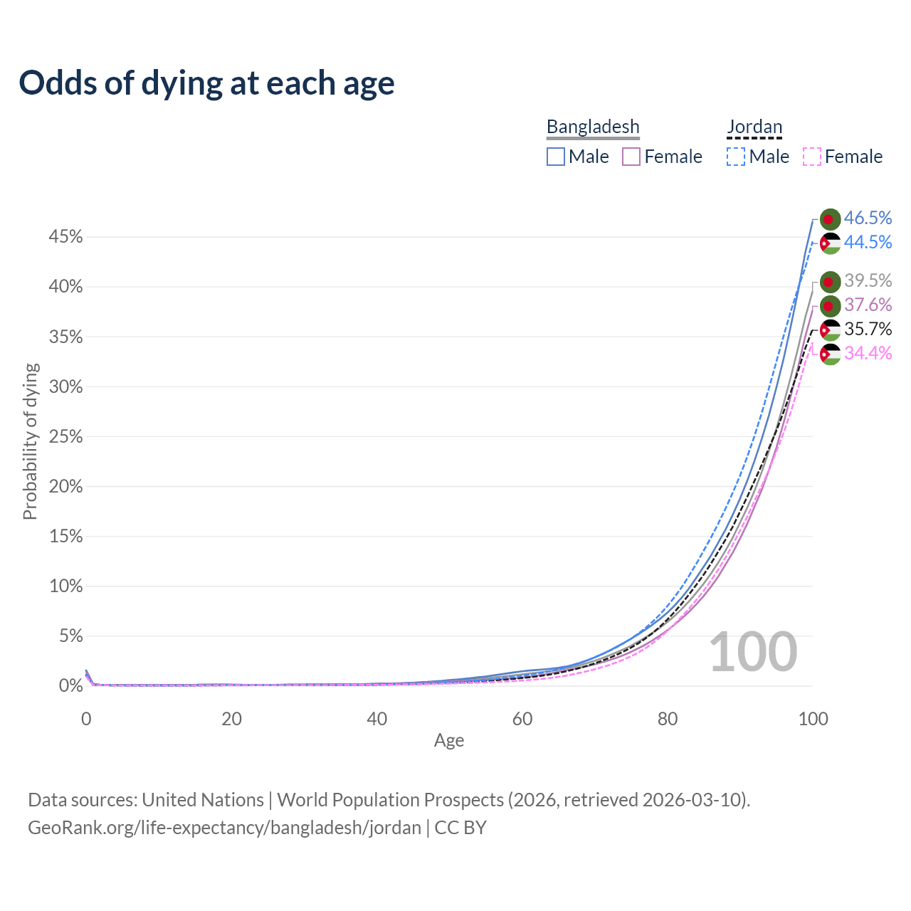 This life expectancy calculator shows the odds of living to 100, 95, 90, and below based on current age for both males and females in Bangladesh and Jordan, along with mean and median age of death. The calculations are based on the 2026 life tables (actuarial tables) from the UN World Population Prospects.