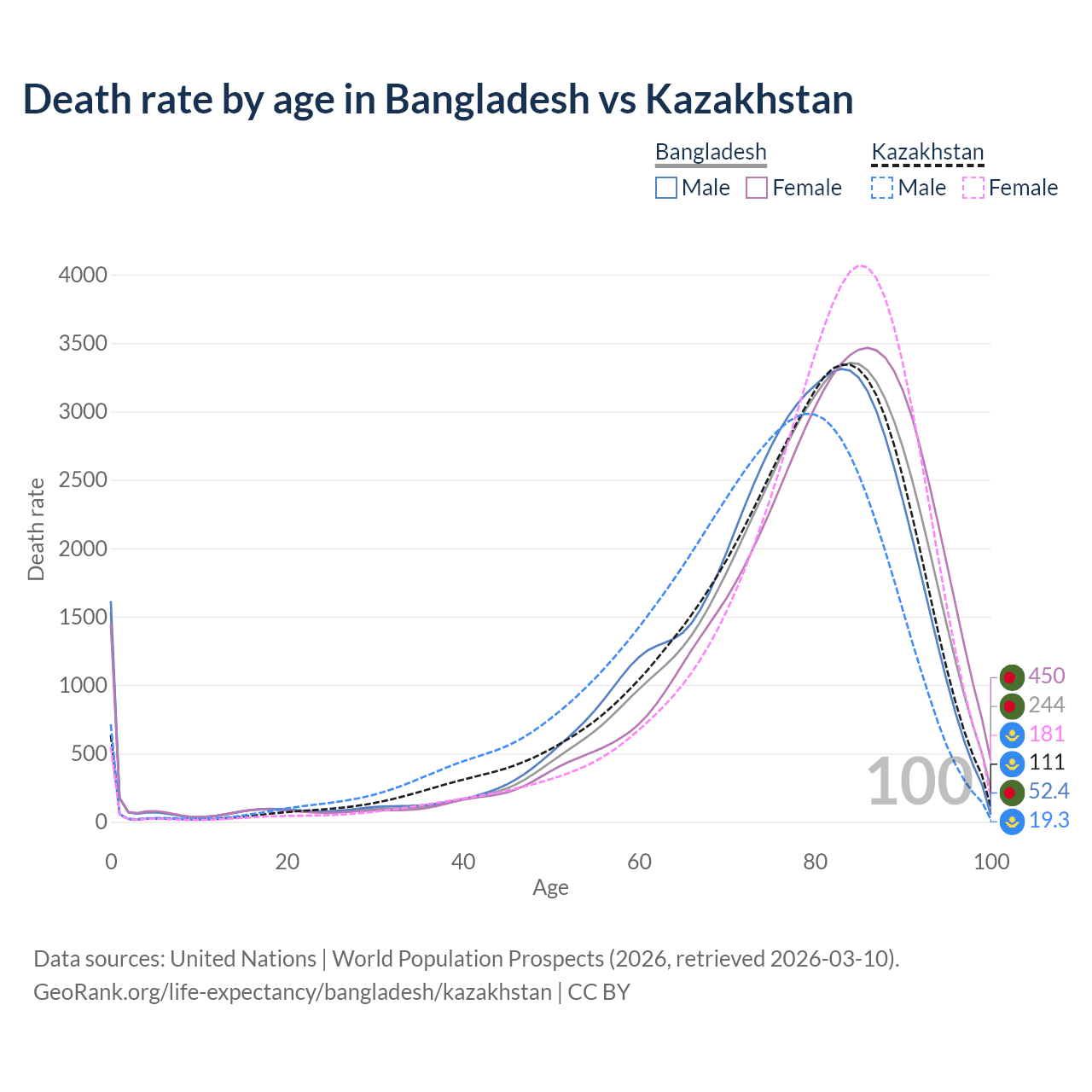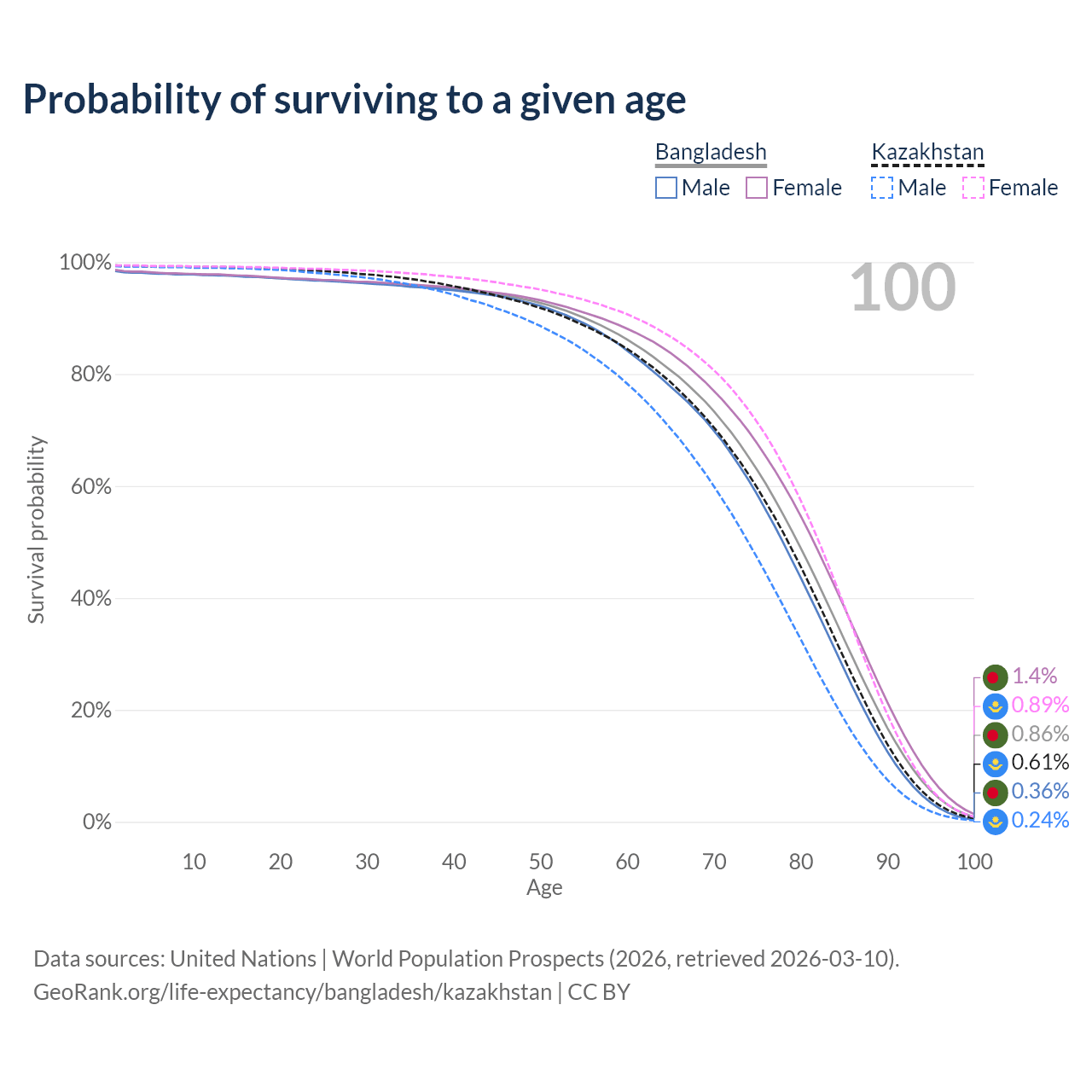 This life expectancy calculator shows the odds of living to 100, 95, 90, and below based on current age for both males and females in Bangladesh and Kazakhstan, along with mean and median age of death. The calculations are based on the 2026 life tables (actuarial tables) from the UN World Population Prospects.