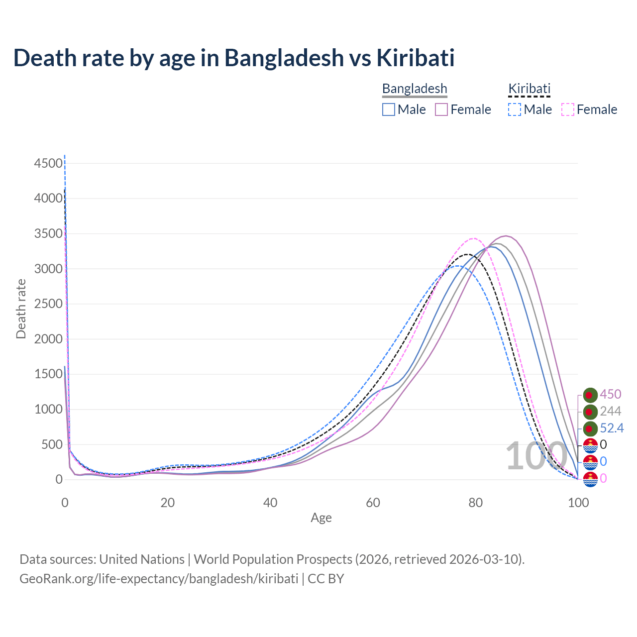 In Bangladesh, the most common age of death is 84, compared to 0 in Kiribati. The median age of death is 79.7 in Bangladesh and 73.1 in Kiribati, meaning only half of each cohort is expected to live past that age.