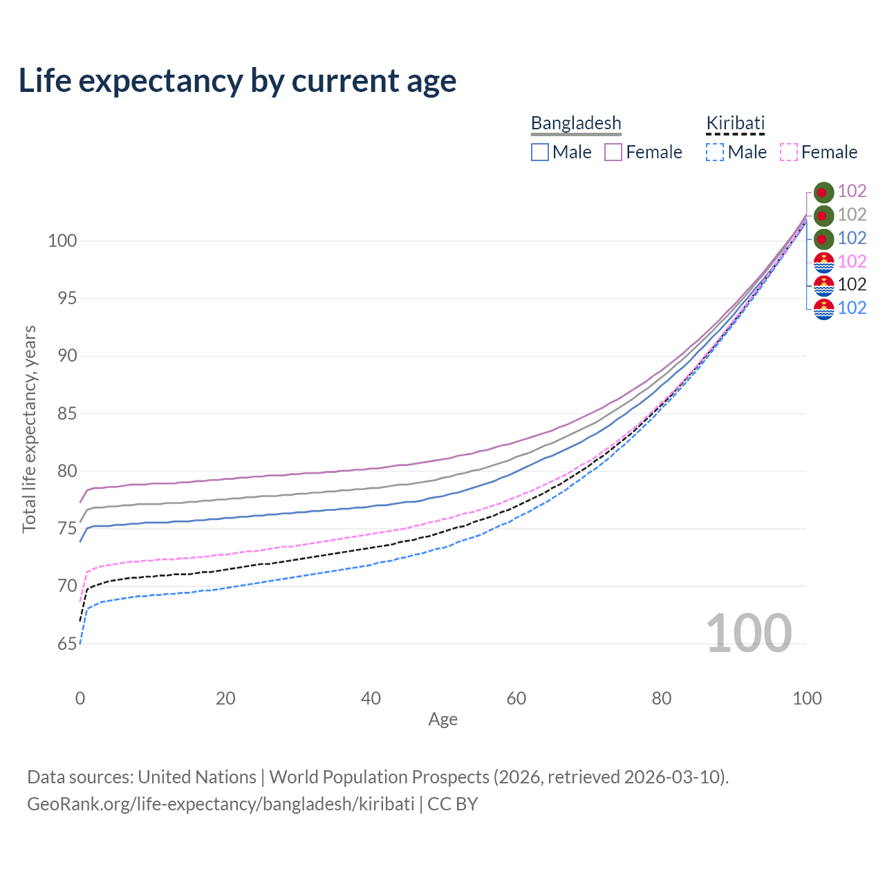 This life expectancy calculator shows the odds of living to 100, 95, 90, and below based on current age for both males and females in Bangladesh and Kiribati, along with mean and median age of death. The calculations are based on the 2026 life tables (actuarial tables) from the UN World Population Prospects.