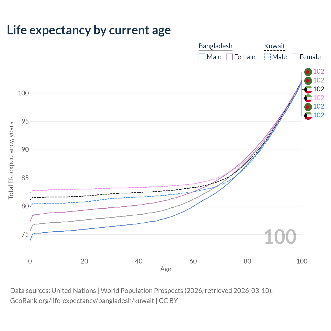 This life expectancy calculator shows the odds of living to 100, 95, 90, and below based on current age for both males and females in Bangladesh and Kuwait, along with mean and median age of death. The calculations are based on the 2026 life tables (actuarial tables) from the UN World Population Prospects.