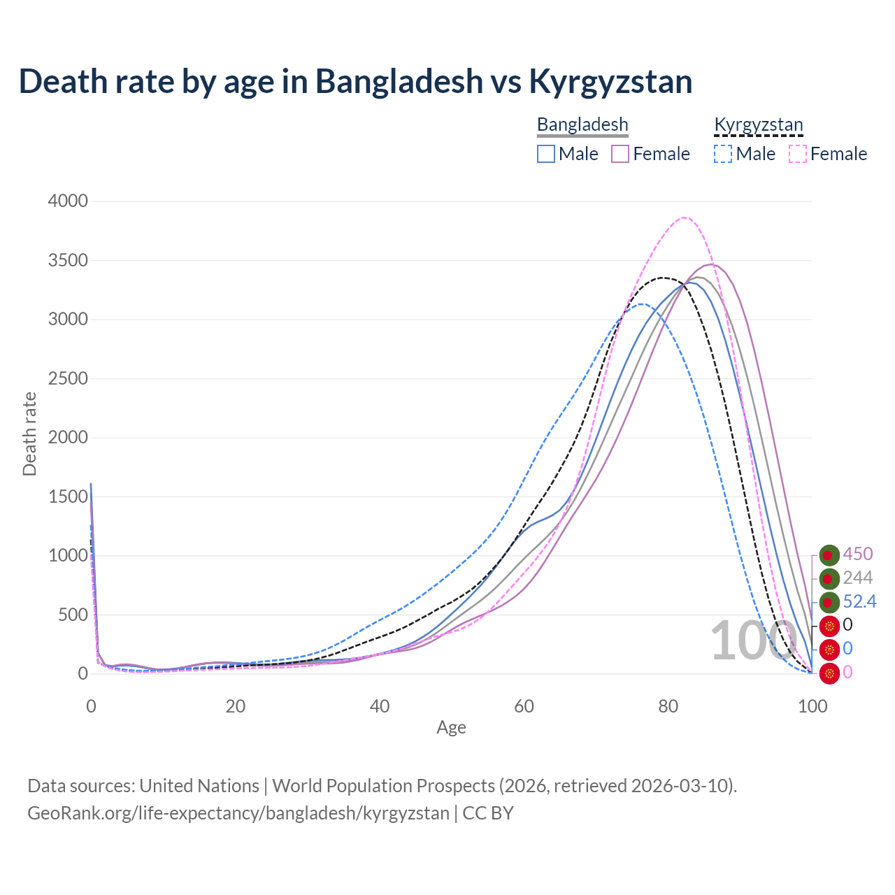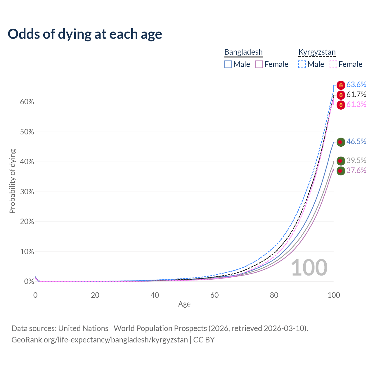 This life expectancy calculator shows the odds of living to 100, 95, 90, and below based on current age for both males and females in Bangladesh and Kyrgyzstan, along with mean and median age of death. The calculations are based on the 2026 life tables (actuarial tables) from the UN World Population Prospects.