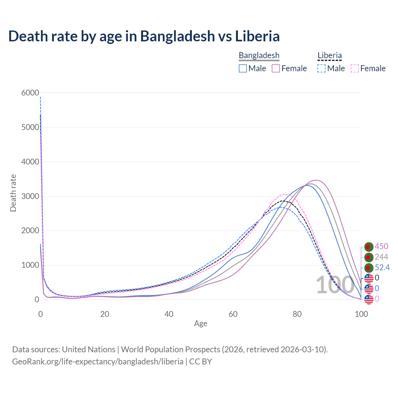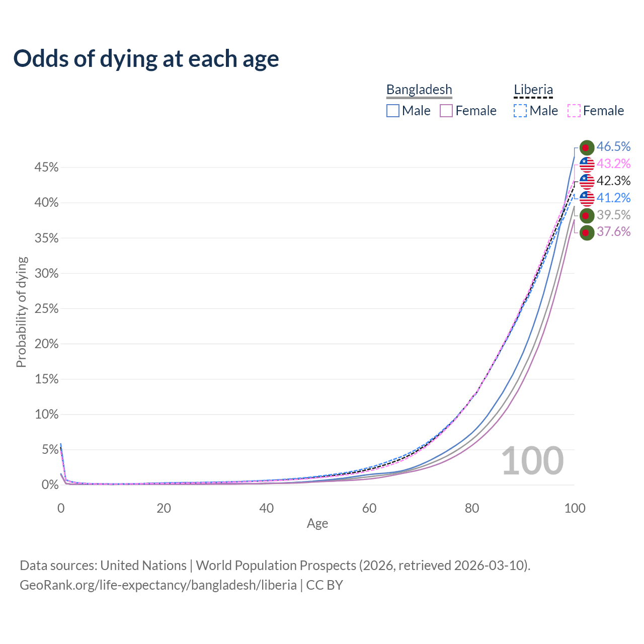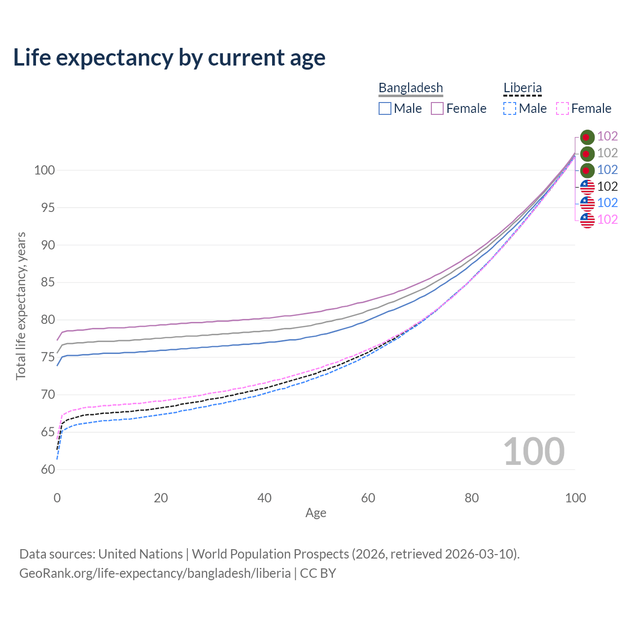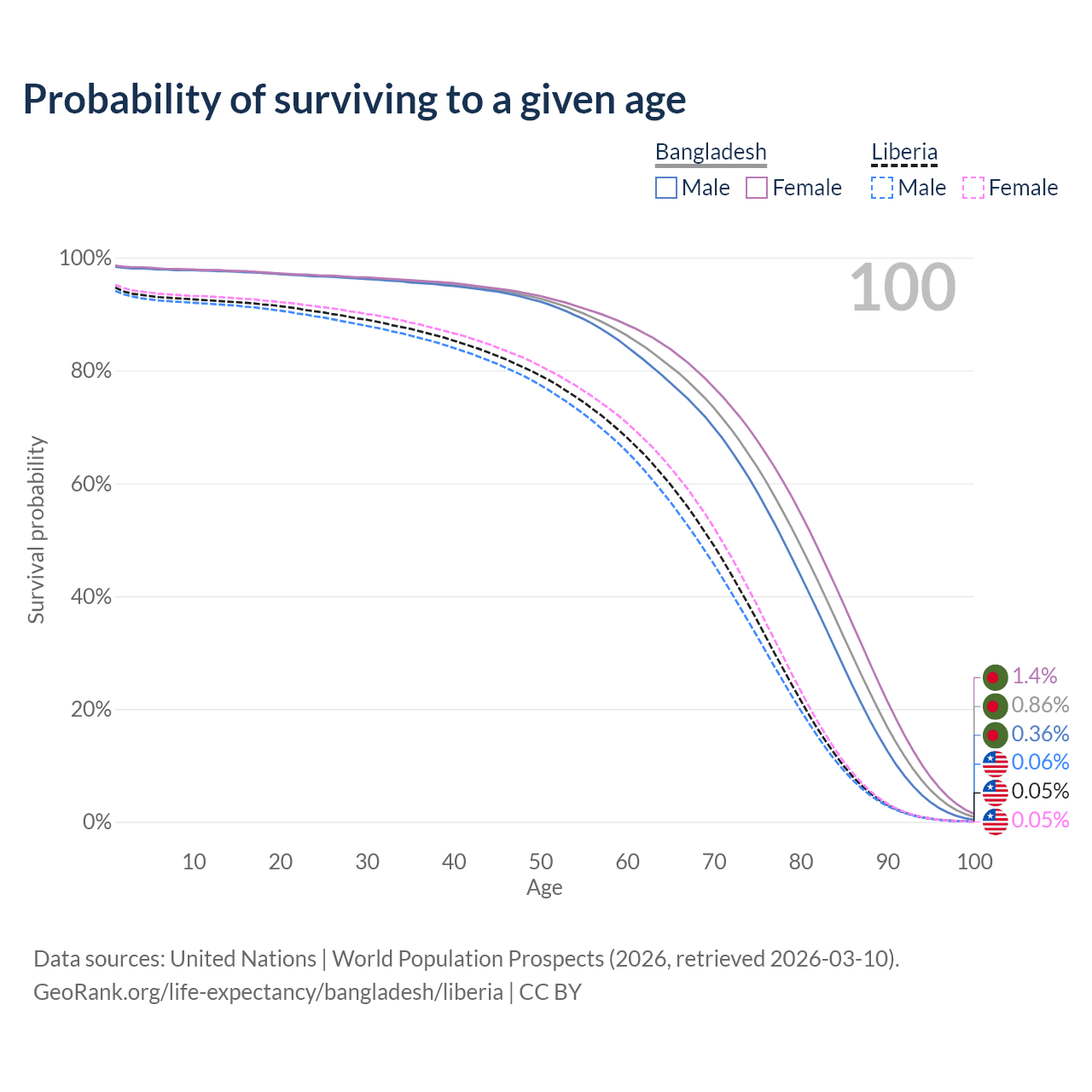 This life expectancy calculator shows the odds of living to 100, 95, 90, and below based on current age for both males and females in Bangladesh and Liberia, along with mean and median age of death. The calculations are based on the 2026 life tables (actuarial tables) from the UN World Population Prospects.