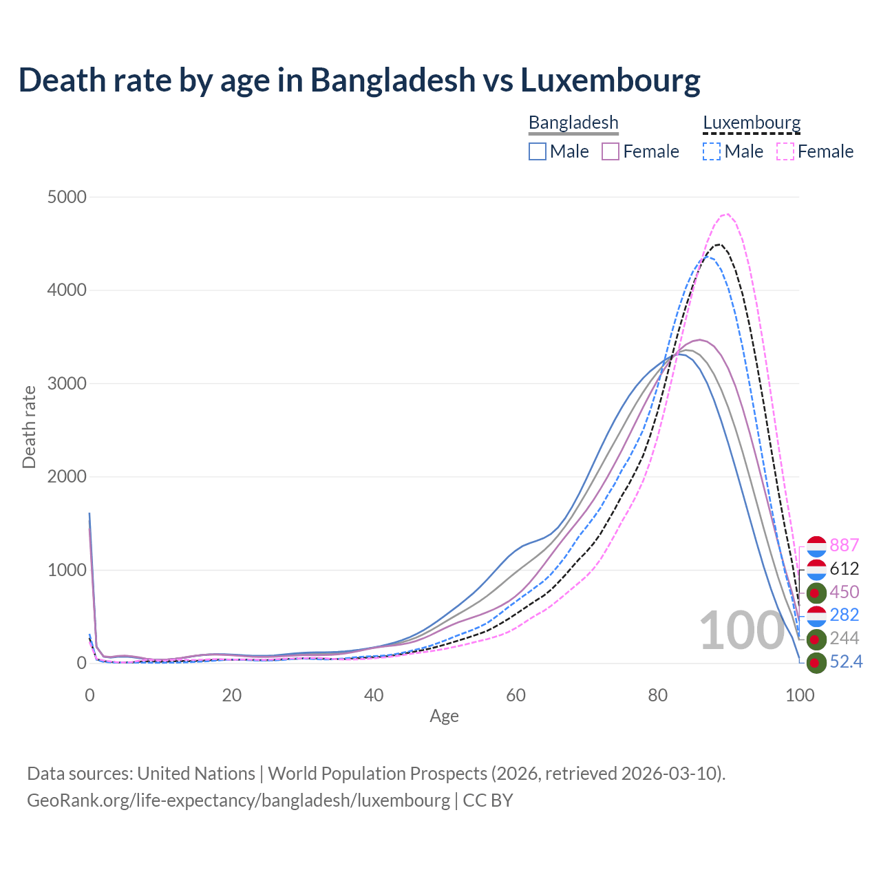 In Bangladesh, the most common age of death is 84, compared to 89 in Luxembourg. The median age of death is 79.7 in Bangladesh and 85.7 in Luxembourg, meaning only half of each cohort is expected to live past that age.