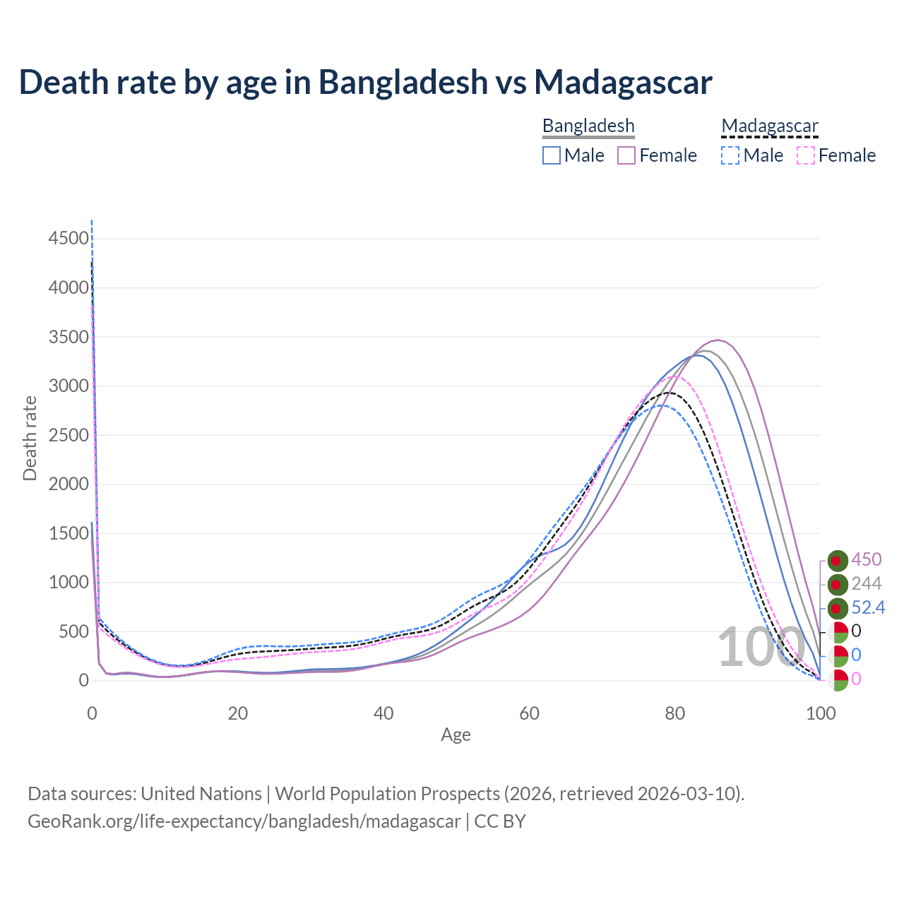 In Bangladesh, the most common age of death is 84, compared to 0 in Madagascar. The median age of death is 79.7 in Bangladesh and 72.2 in Madagascar, meaning only half of each cohort is expected to live past that age.
