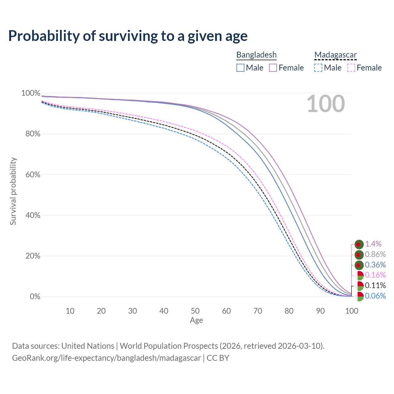This life expectancy calculator shows the odds of living to 100, 95, 90, and below based on current age for both males and females in Bangladesh and Madagascar, along with mean and median age of death. The calculations are based on the 2026 life tables (actuarial tables) from the UN World Population Prospects.