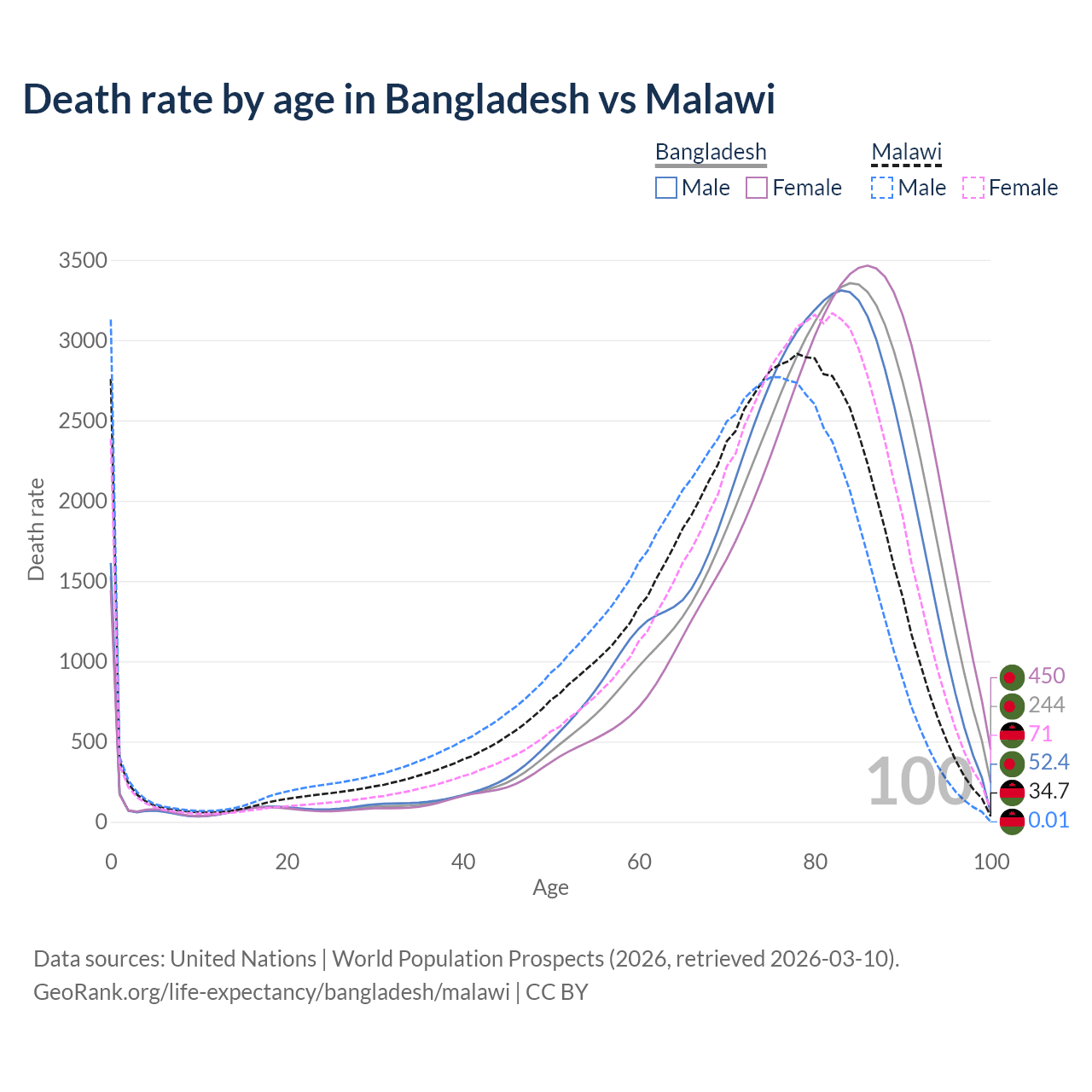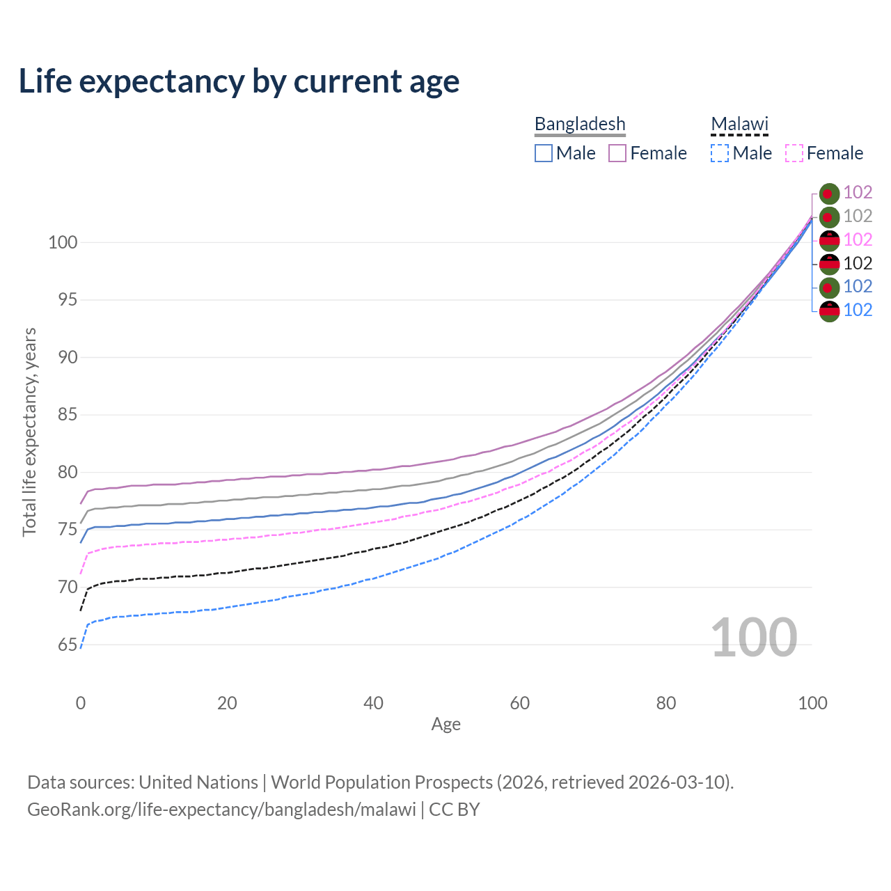 This life expectancy calculator shows the odds of living to 100, 95, 90, and below based on current age for both males and females in Bangladesh and Malawi, along with mean and median age of death. The calculations are based on the 2026 life tables (actuarial tables) from the UN World Population Prospects.