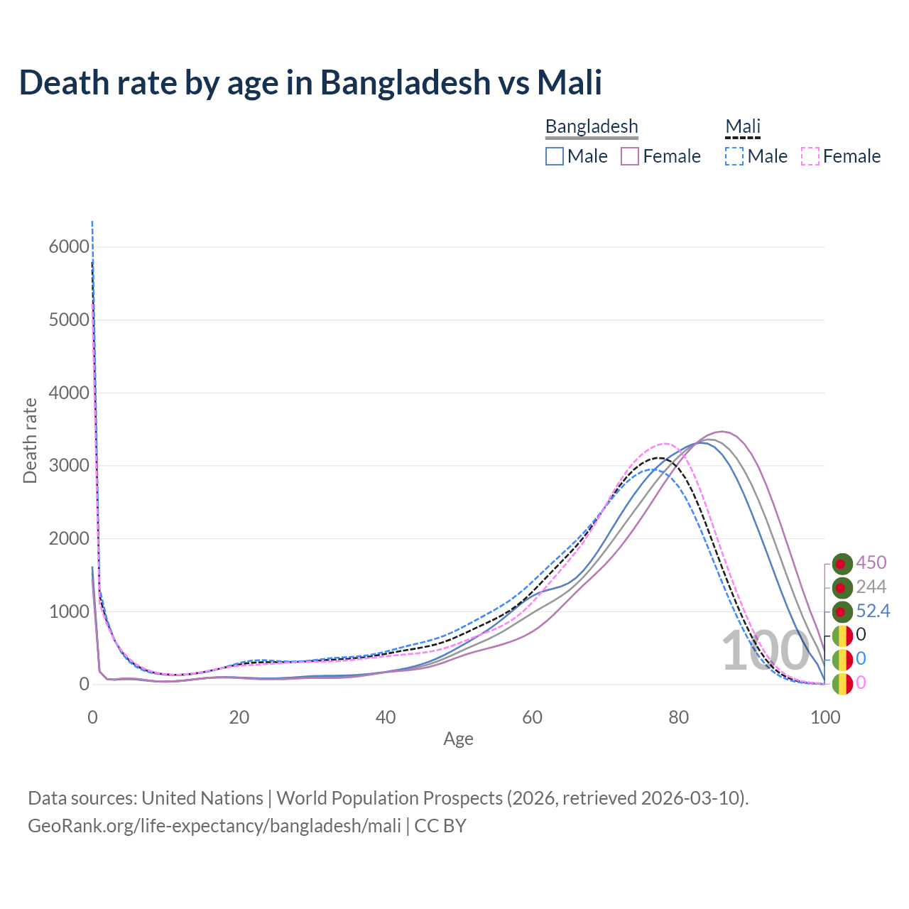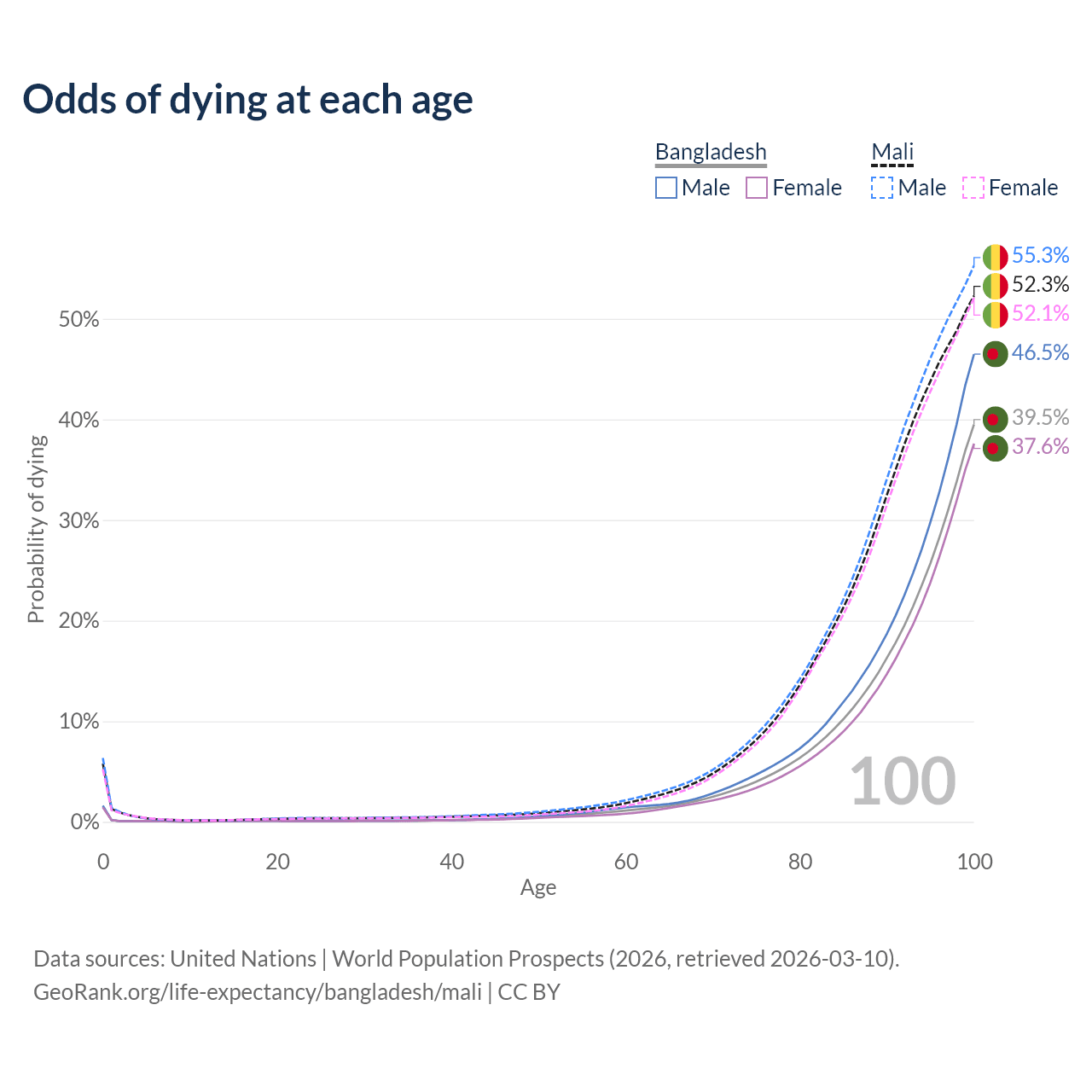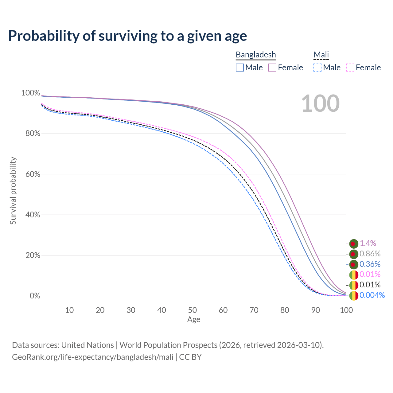 This life expectancy calculator shows the odds of living to 100, 95, 90, and below based on current age for both males and females in Bangladesh and Mali, along with mean and median age of death. The calculations are based on the 2026 life tables (actuarial tables) from the UN World Population Prospects.