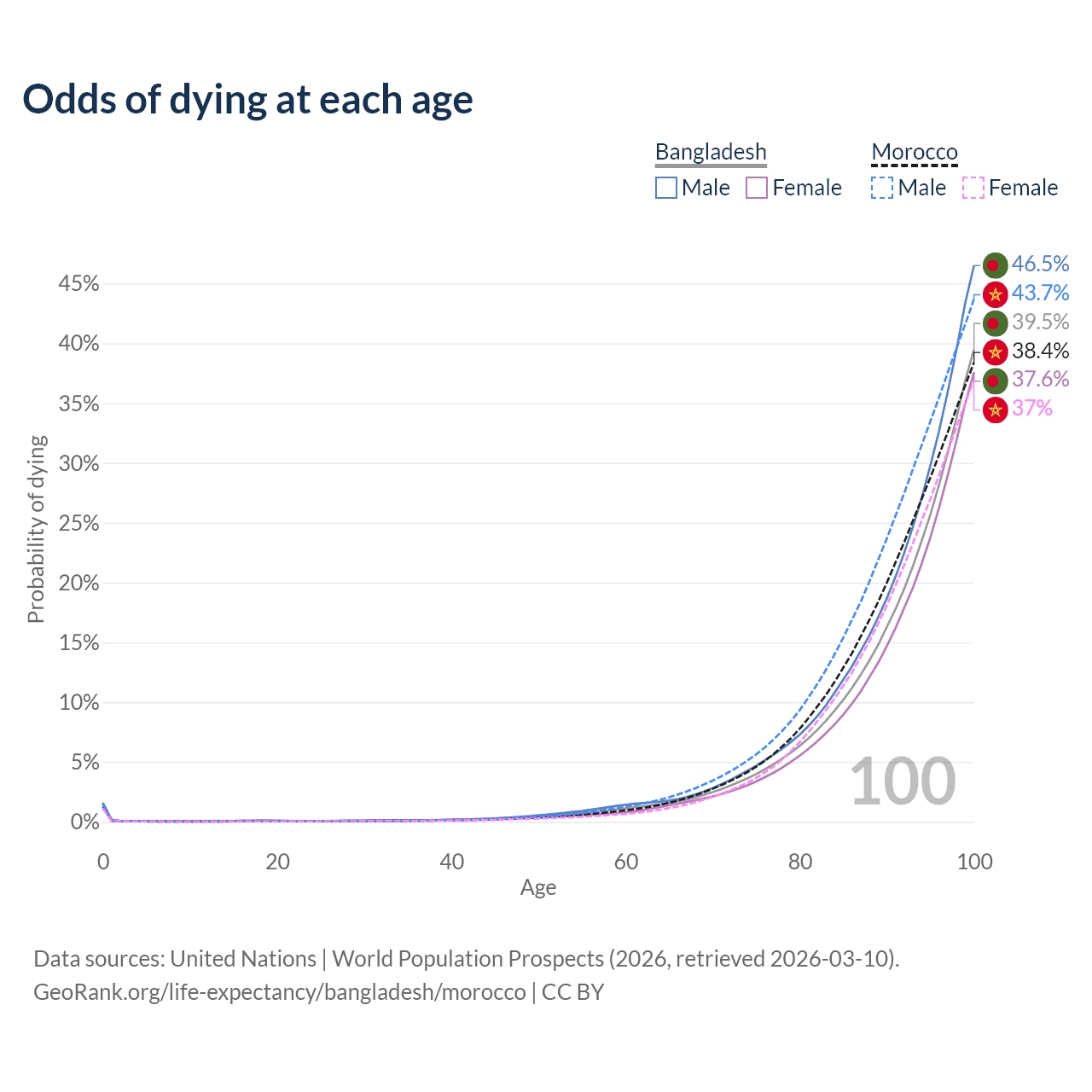 This life expectancy calculator shows the odds of living to 100, 95, 90, and below based on current age for both males and females in Bangladesh and Morocco, along with mean and median age of death. The calculations are based on the 2026 life tables (actuarial tables) from the UN World Population Prospects.