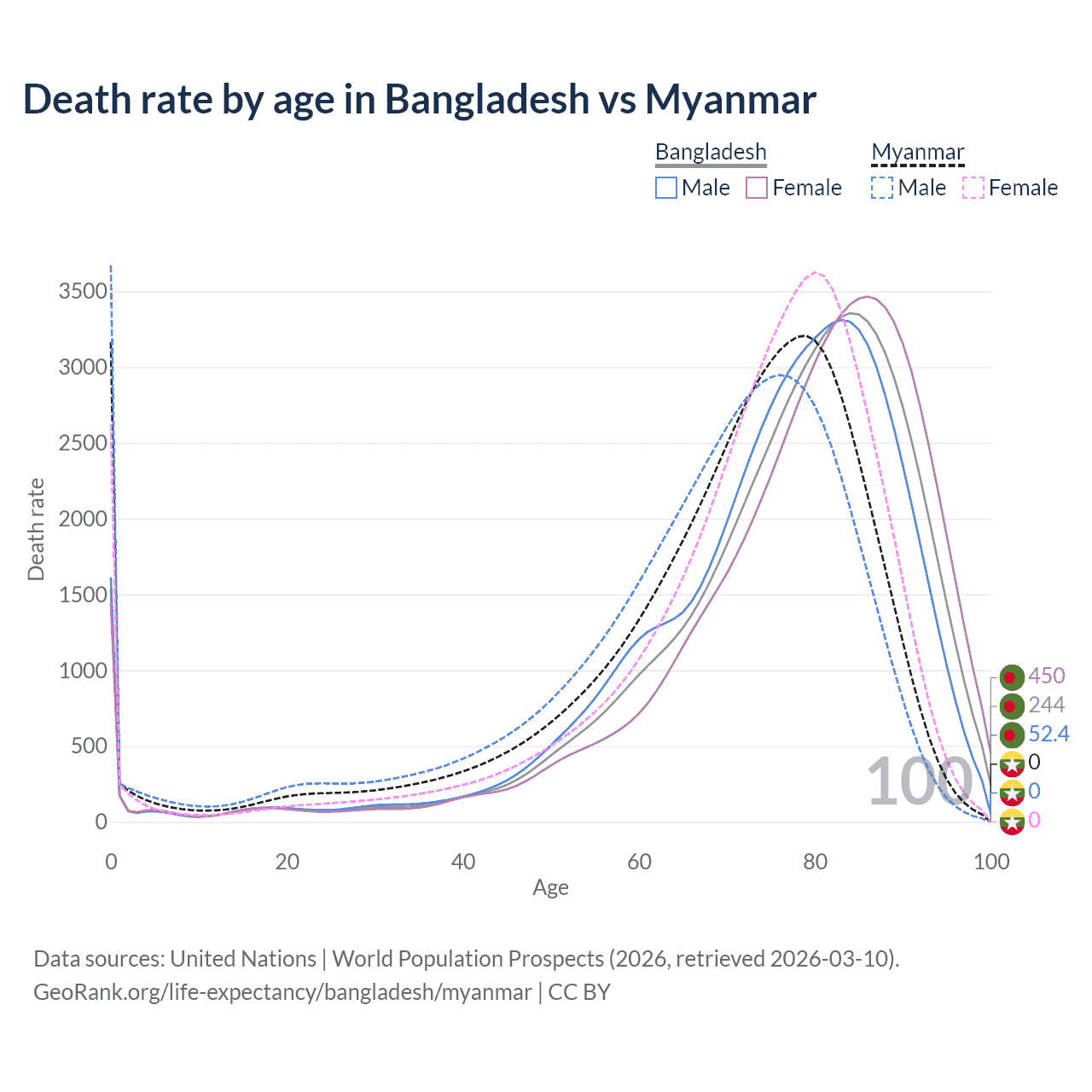 In Bangladesh, the most common age of death is 84, compared to 79 in Myanmar. The median age of death is 79.7 in Bangladesh and 73.1 in Myanmar, meaning only half of each cohort is expected to live past that age.