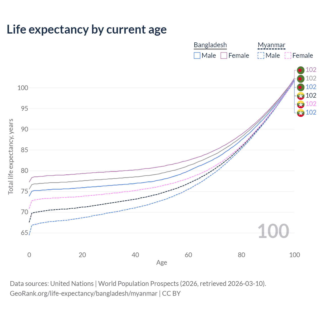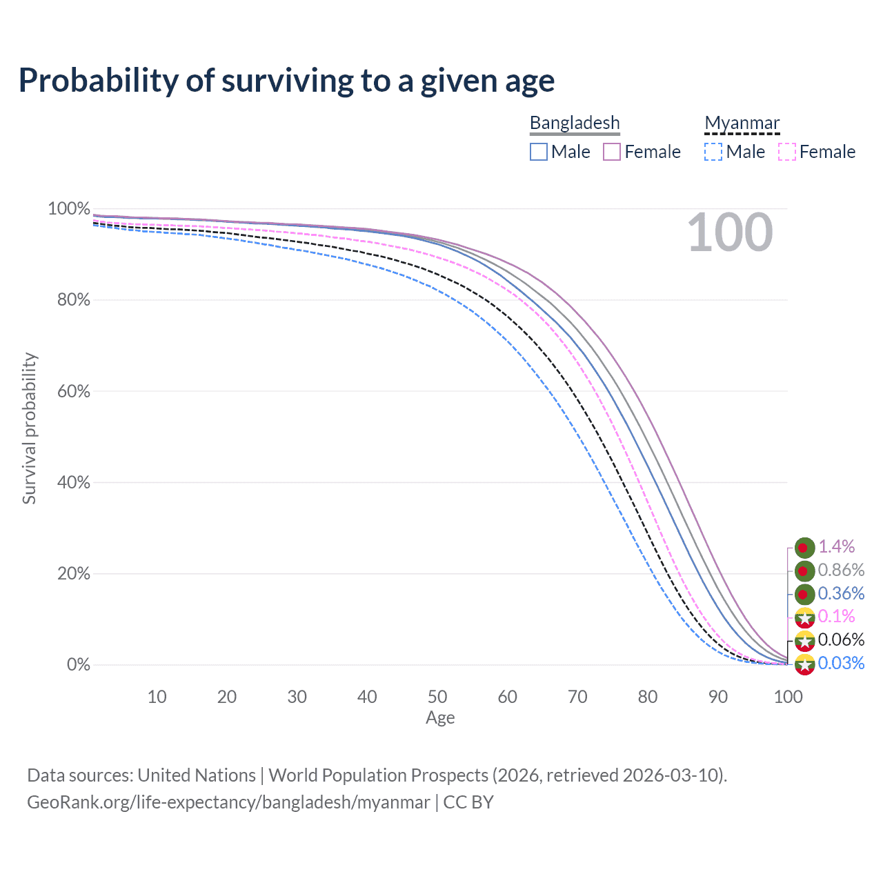 This life expectancy calculator shows the odds of living to 100, 95, 90, and below based on current age for both males and females in Bangladesh and Myanmar, along with mean and median age of death. The calculations are based on the 2026 life tables (actuarial tables) from the UN World Population Prospects.