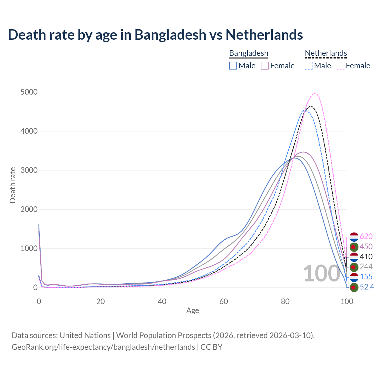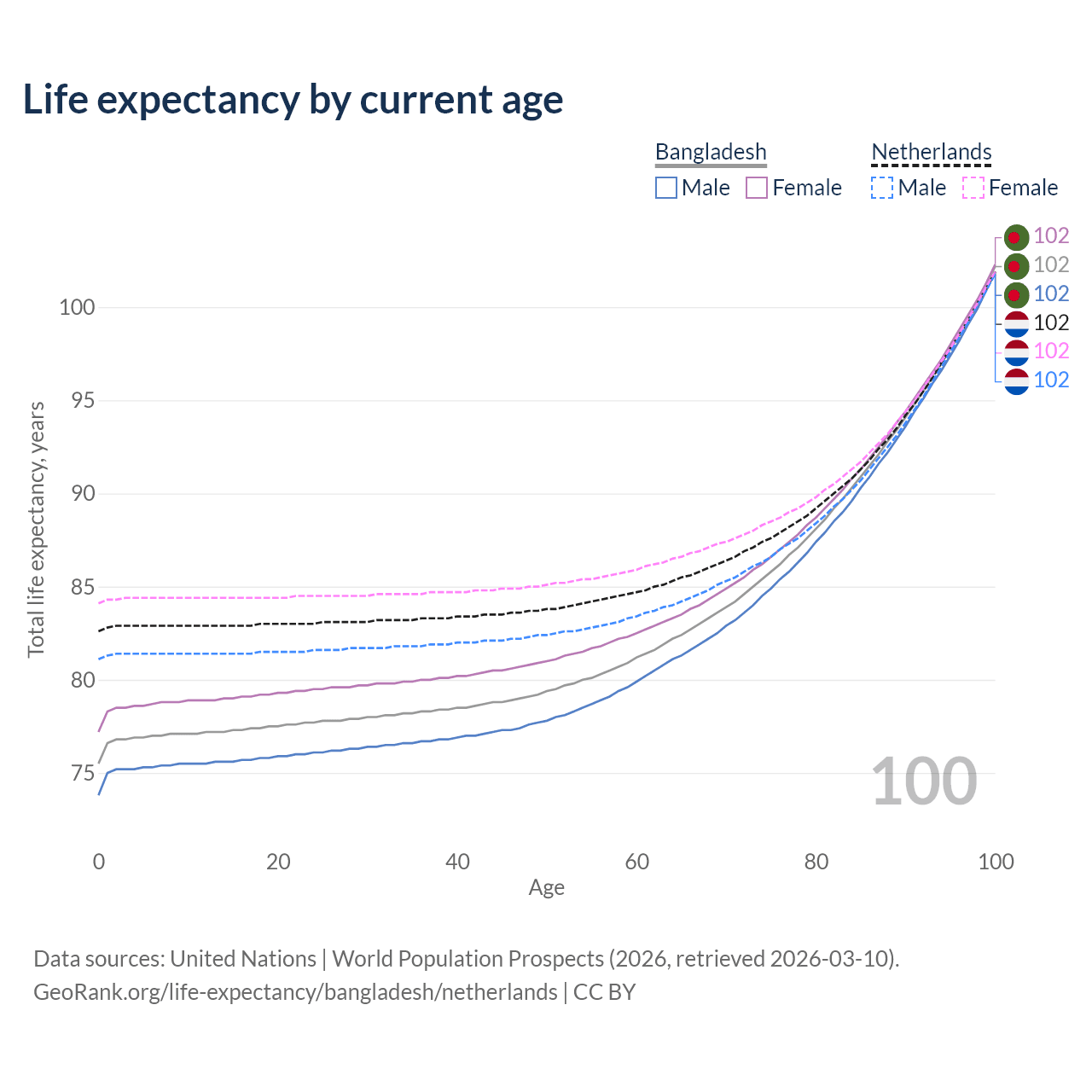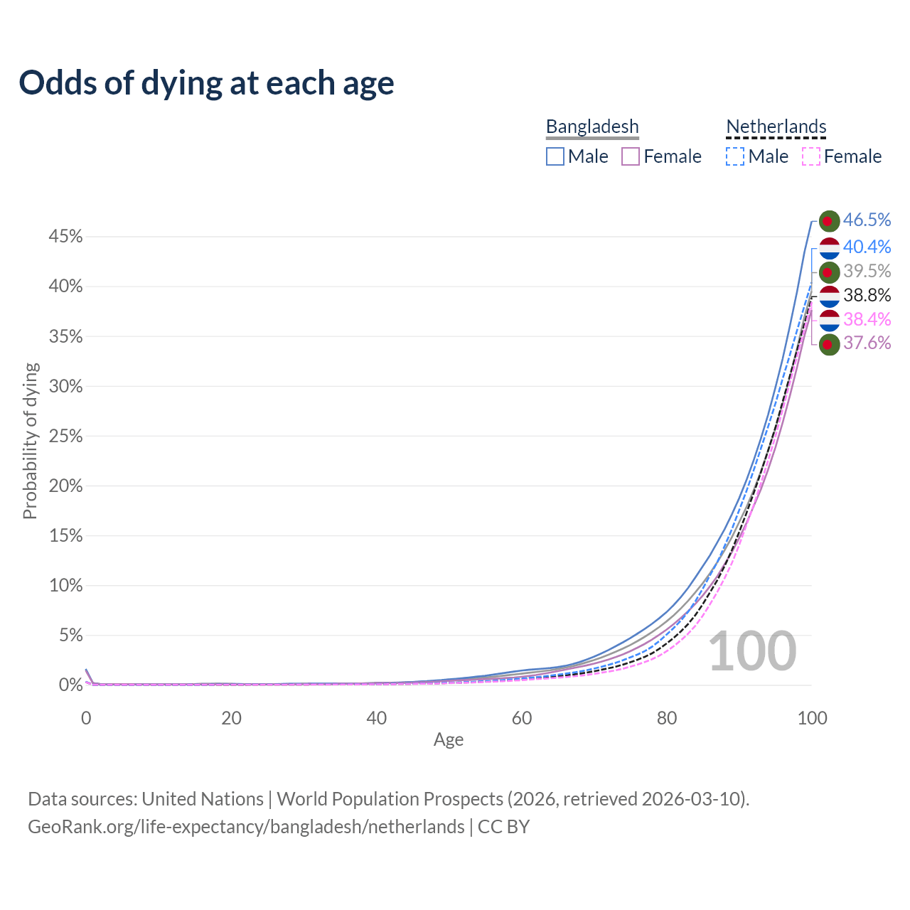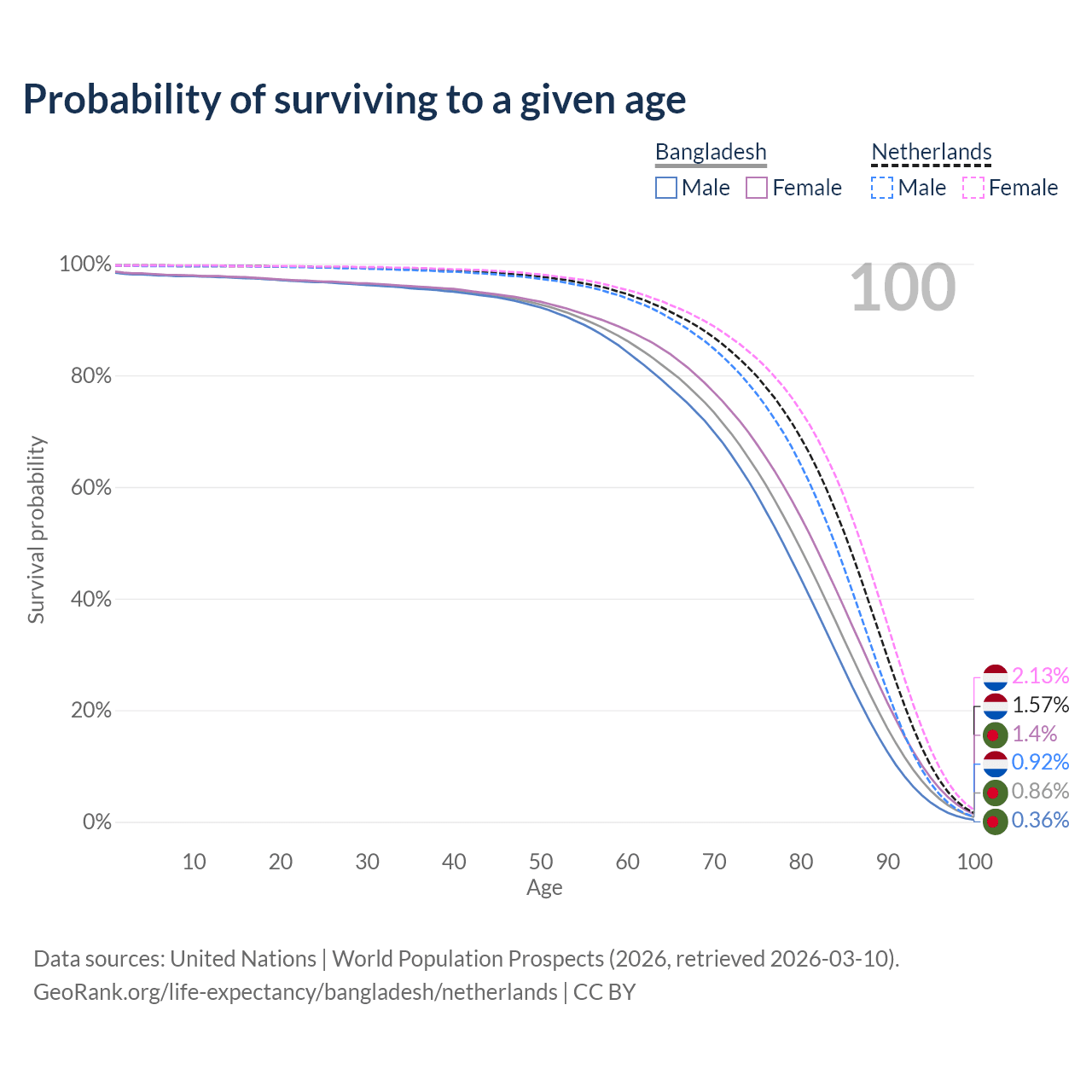 This life expectancy calculator shows the odds of living to 100, 95, 90, and below based on current age for both males and females in Bangladesh and the Netherlands, along with mean and median age of death. The calculations are based on the 2026 life tables (actuarial tables) from the UN World Population Prospects.
