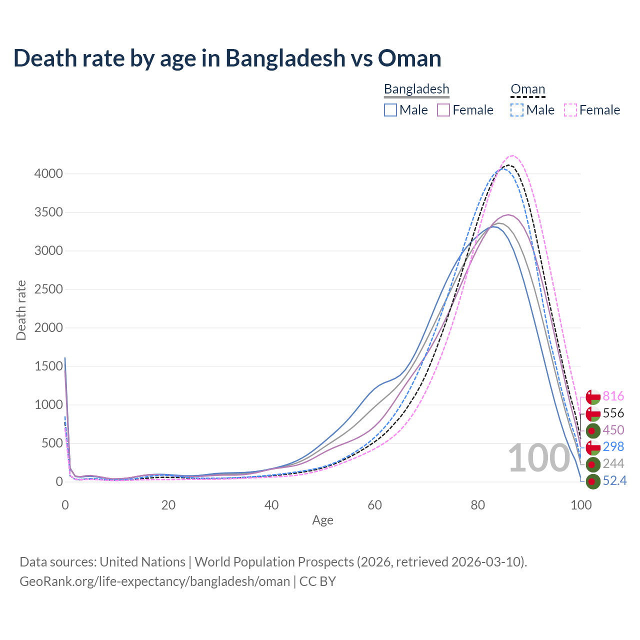 In Bangladesh, the most common age of death is 84, compared to 86 in Oman. The median age of death is 79.7 in Bangladesh and 83.5 in Oman, meaning only half of each cohort is expected to live past that age.