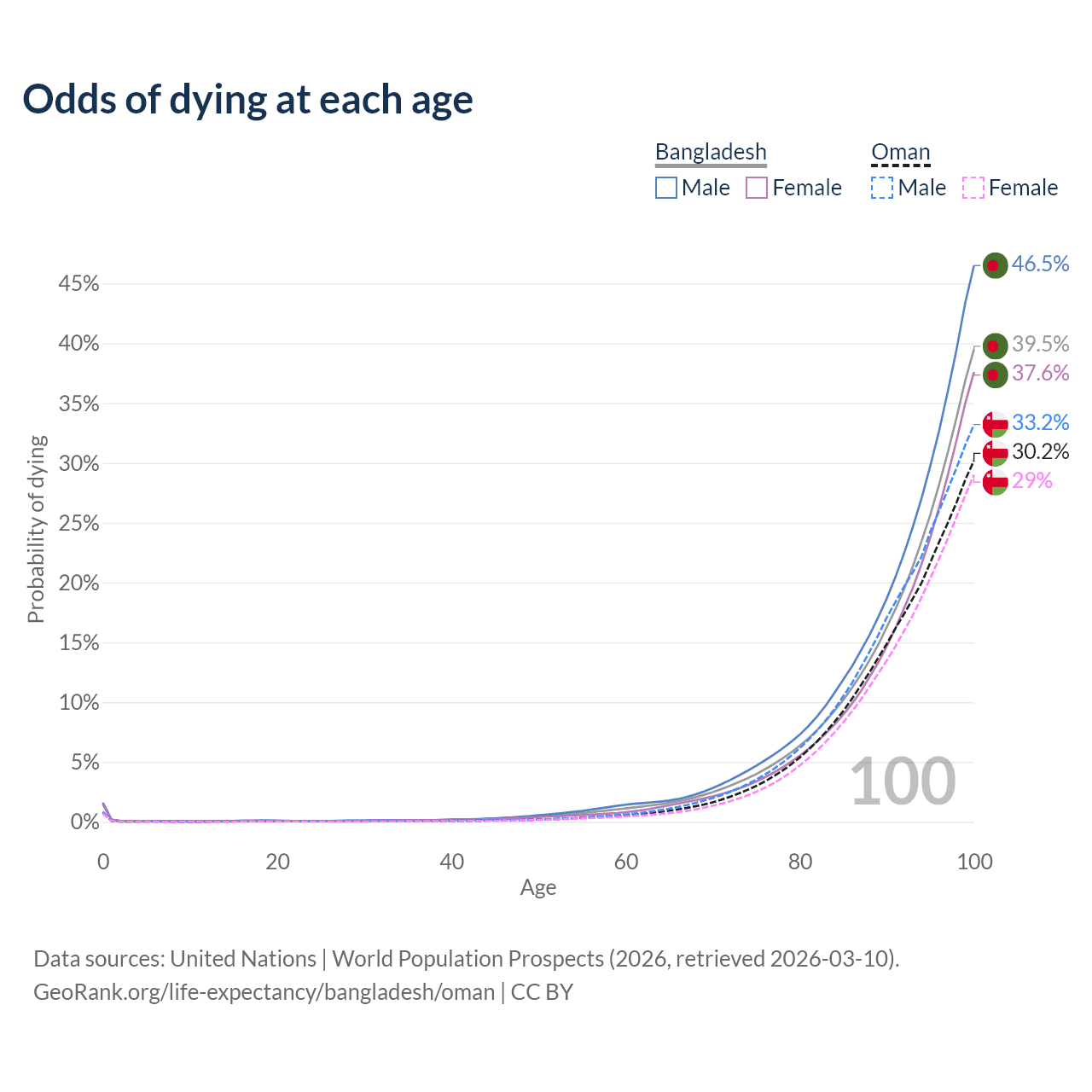 This life expectancy calculator shows the odds of living to 100, 95, 90, and below based on current age for both males and females in Bangladesh and Oman, along with mean and median age of death. The calculations are based on the 2026 life tables (actuarial tables) from the UN World Population Prospects.
