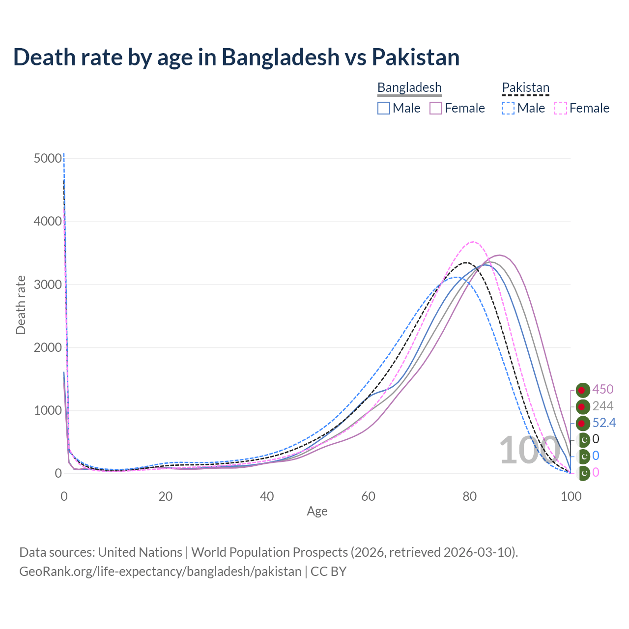 In Bangladesh, the most common age of death is 84, compared to 0 in Pakistan. The median age of death is 79.7 in Bangladesh and 74.3 in Pakistan, meaning only half of each cohort is expected to live past that age.