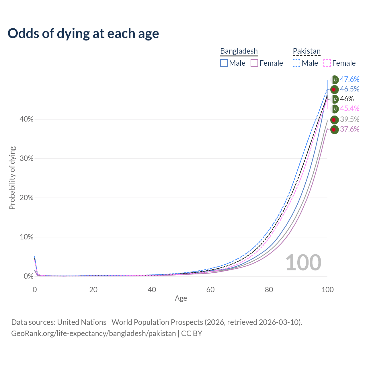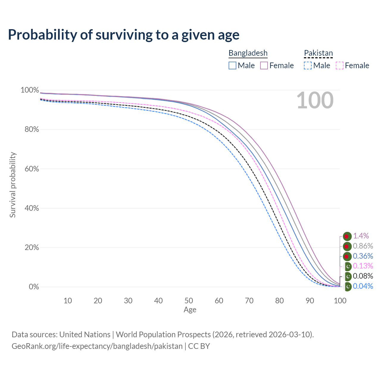 This life expectancy calculator shows the odds of living to 100, 95, 90, and below based on current age for both males and females in Bangladesh and Pakistan, along with mean and median age of death. The calculations are based on the 2026 life tables (actuarial tables) from the UN World Population Prospects.