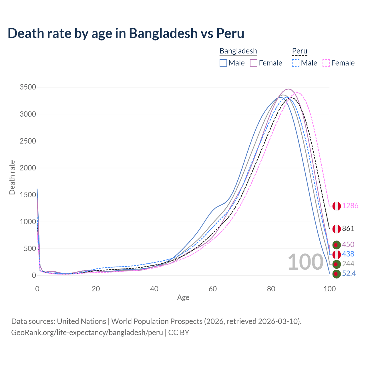 In Bangladesh, the most common age of death is 84, compared to 87 in Peru. The median age of death is 79.7 in Bangladesh and 82.4 in Peru, meaning only half of each cohort is expected to live past that age.