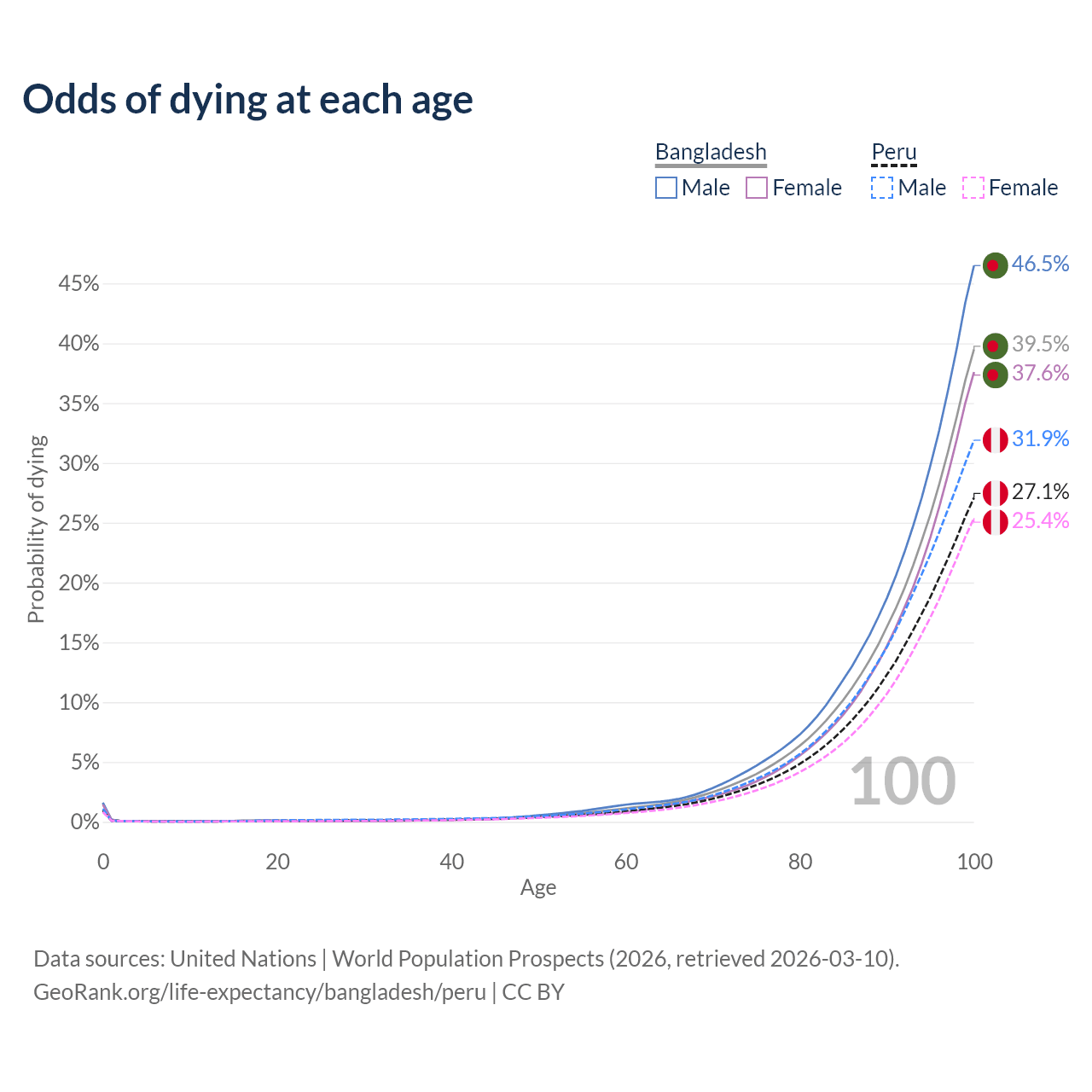 This life expectancy calculator shows the odds of living to 100, 95, 90, and below based on current age for both males and females in Bangladesh and Peru, along with mean and median age of death. The calculations are based on the 2026 life tables (actuarial tables) from the UN World Population Prospects.