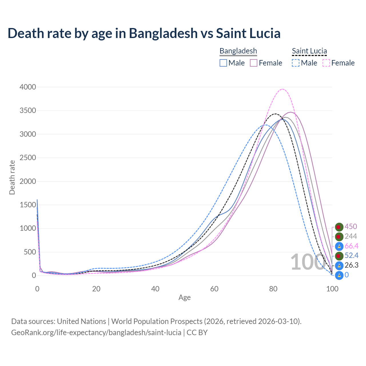 In Bangladesh, the most common age of death is 84, compared to 81 in Saint Lucia. The median age of death is 79.7 in Bangladesh and 76.8 in Saint Lucia, meaning only half of each cohort is expected to live past that age.