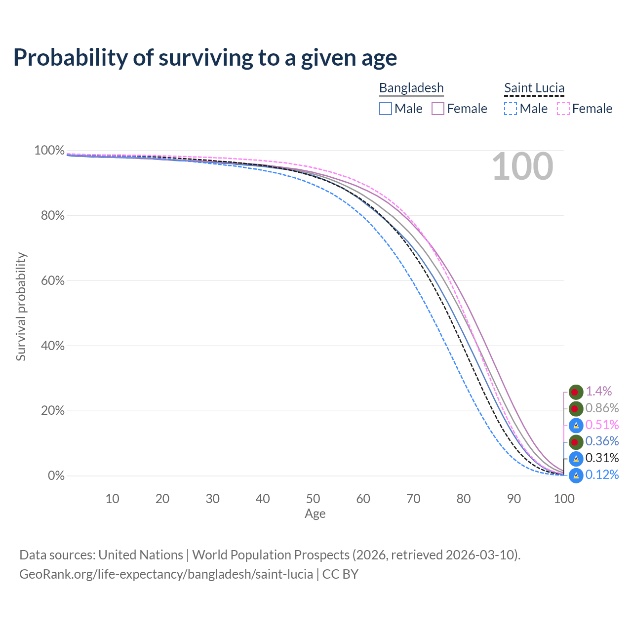 This life expectancy calculator shows the odds of living to 100, 95, 90, and below based on current age for both males and females in Bangladesh and Saint Lucia, along with mean and median age of death. The calculations are based on the 2026 life tables (actuarial tables) from the UN World Population Prospects.