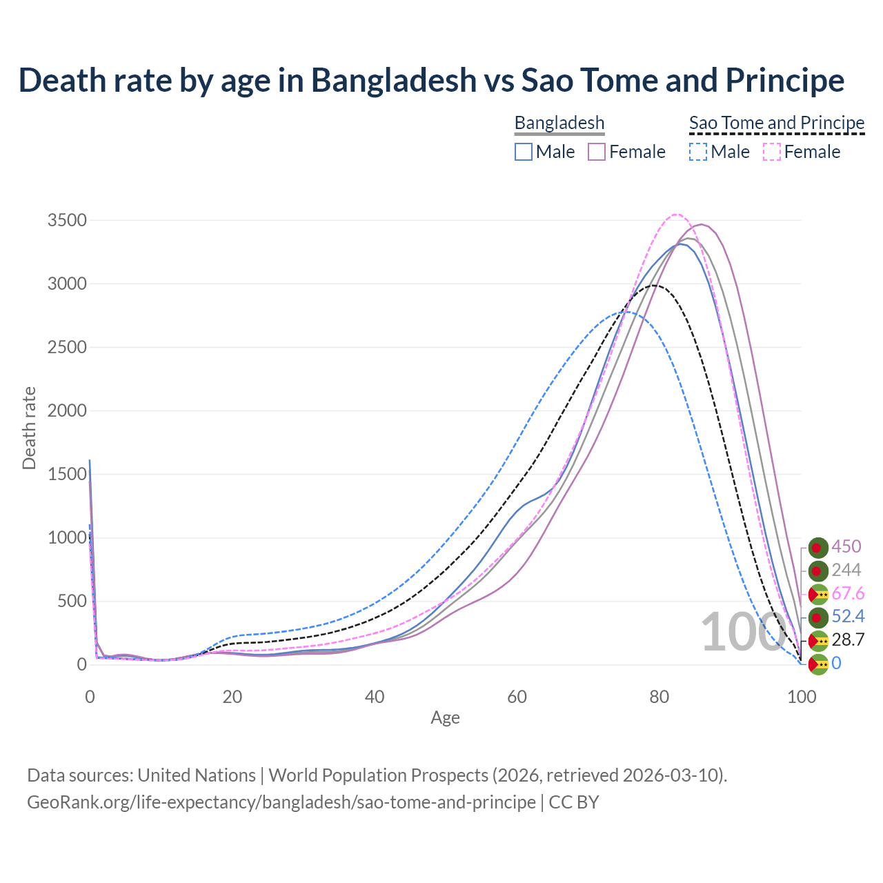 In Bangladesh, the most common age of death is 84, compared to 79 in Sao Tome and Principe. The median age of death is 79.7 in Bangladesh and 74.1 in Sao Tome and Principe, meaning only half of each cohort is expected to live past that age.