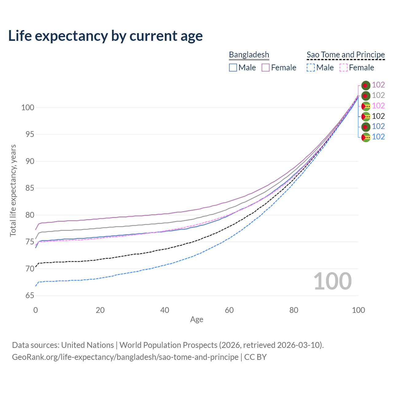 Bangladesh vs Sao Tome and Principe life expectancy calculator