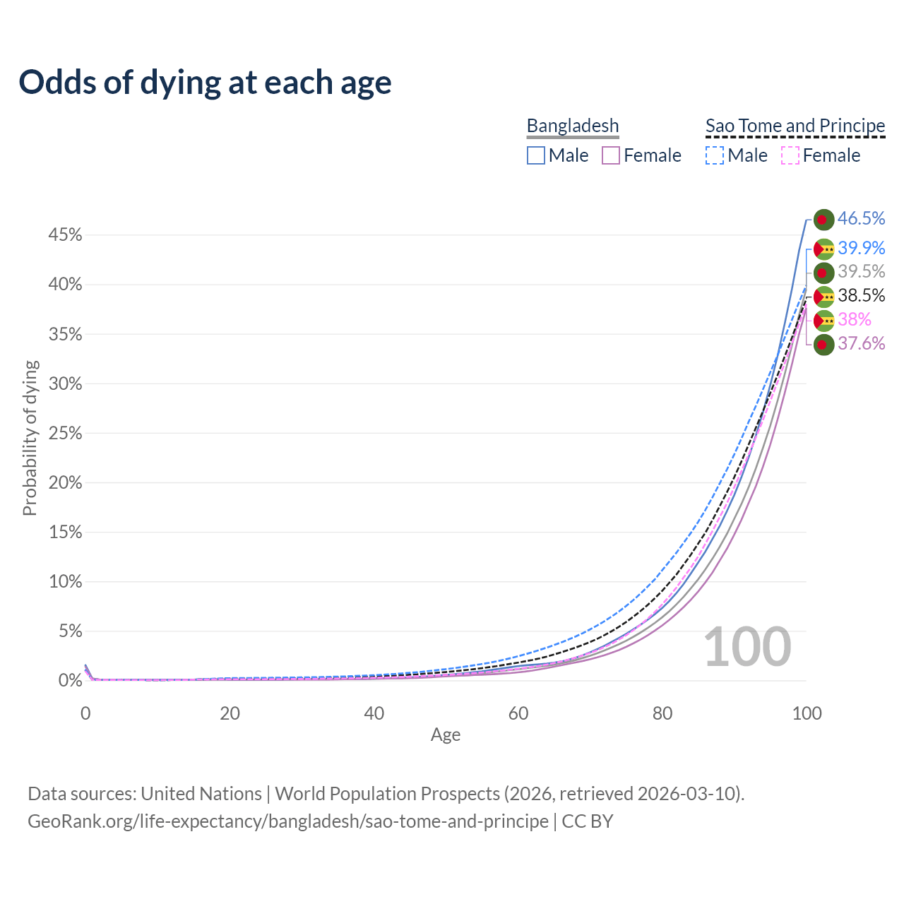 This life expectancy calculator shows the odds of living to 100, 95, 90, and below based on current age for both males and females in Bangladesh and Sao Tome and Principe, along with mean and median age of death. The calculations are based on the 2026 life tables (actuarial tables) from the UN World Population Prospects.