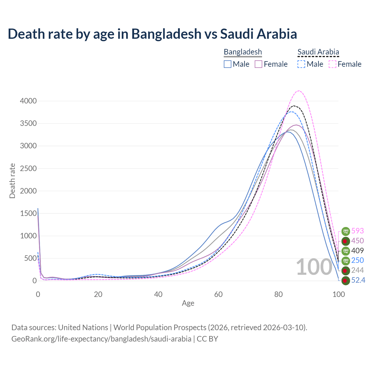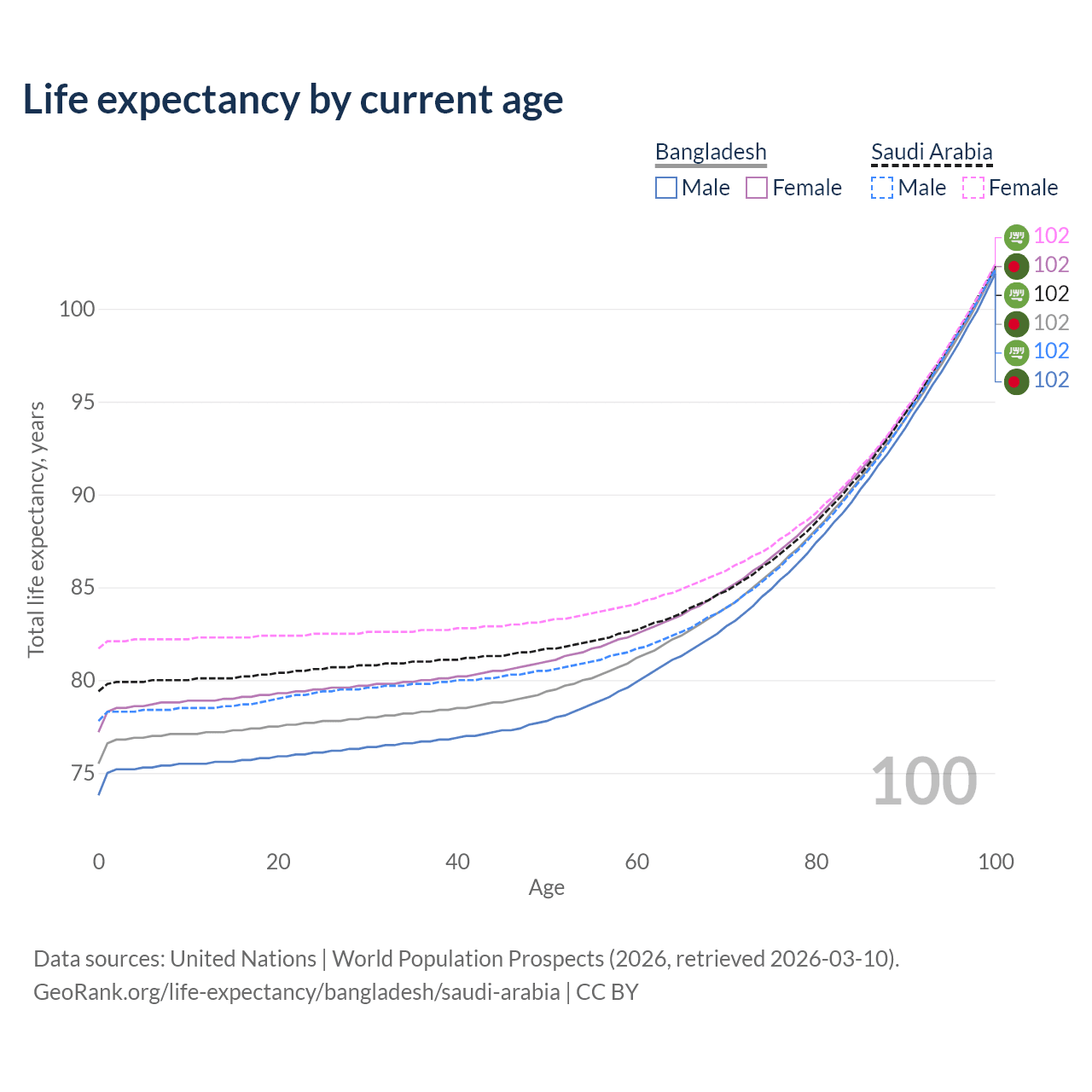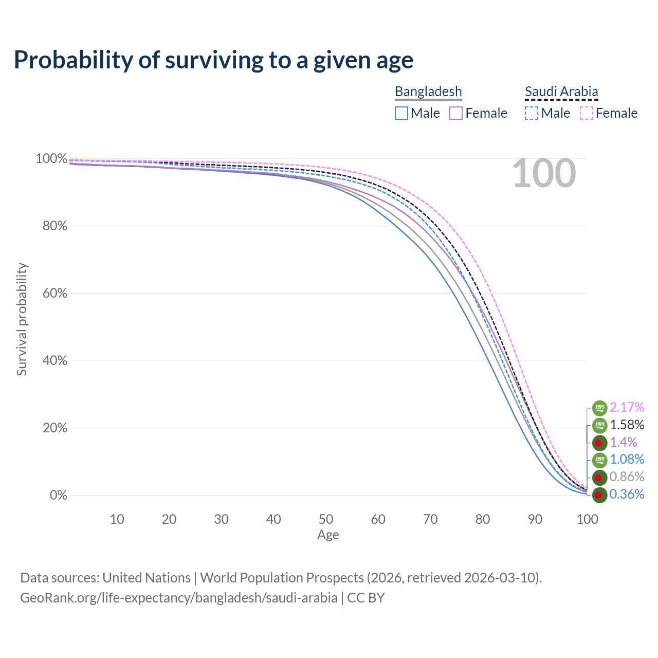 This life expectancy calculator shows the odds of living to 100, 95, 90, and below based on current age for both males and females in Bangladesh and Saudi Arabia, along with mean and median age of death. The calculations are based on the 2026 life tables (actuarial tables) from the UN World Population Prospects.