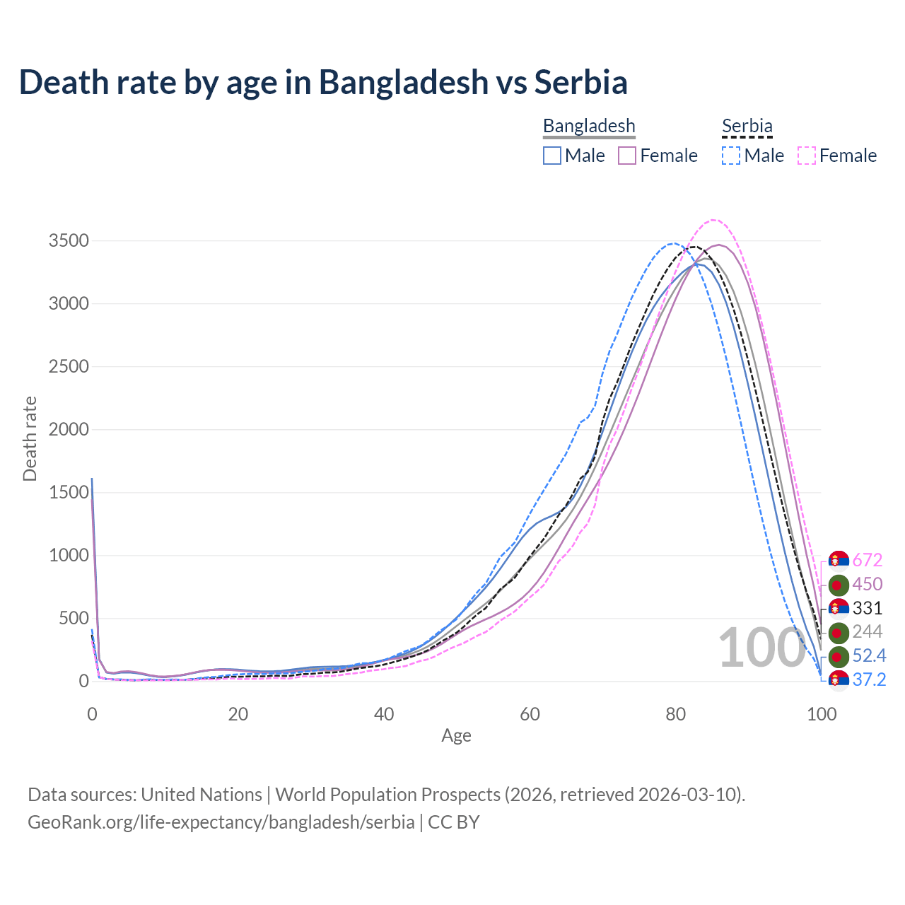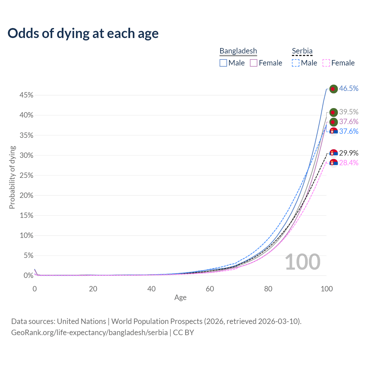 This life expectancy calculator shows the odds of living to 100, 95, 90, and below based on current age for both males and females in Bangladesh and Serbia, along with mean and median age of death. The calculations are based on the 2026 life tables (actuarial tables) from the UN World Population Prospects.