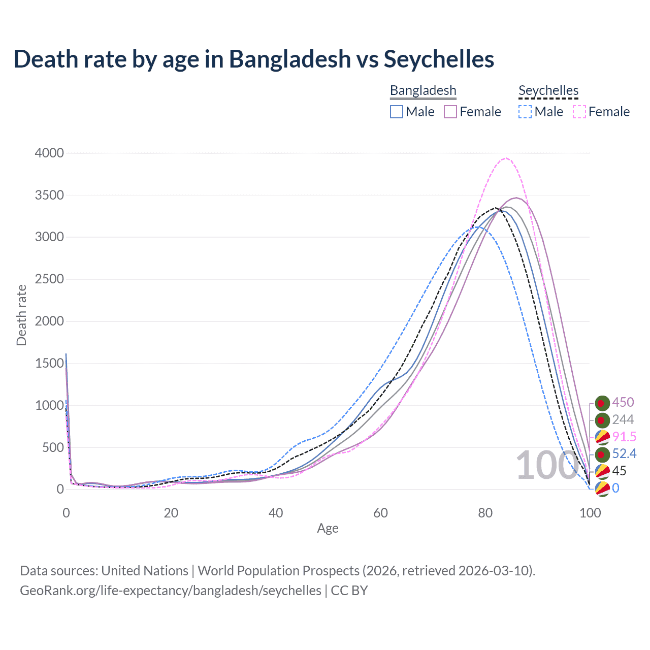 This life expectancy calculator shows the odds of living to 100, 95, 90, and below based on current age for both males and females in Bangladesh and the Seychelles, along with mean and median age of death. The calculations are based on the 2026 life tables (actuarial tables) from the UN World Population Prospects.