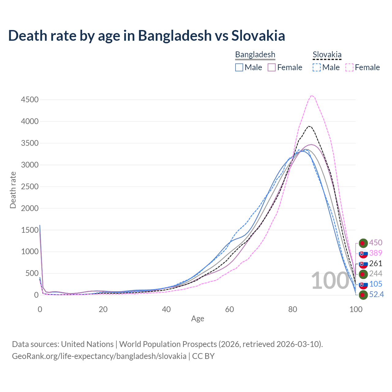 This life expectancy calculator shows the odds of living to 100, 95, 90, and below based on current age for both males and females in Bangladesh and Slovakia, along with mean and median age of death. The calculations are based on the 2026 life tables (actuarial tables) from the UN World Population Prospects.