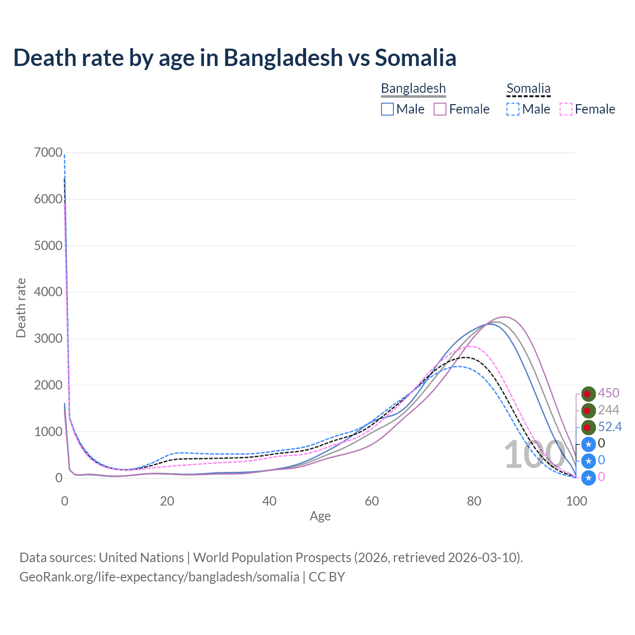 In Bangladesh, the most common age of death is 84, compared to 0 in Somalia. The median age of death is 79.7 in Bangladesh and 69 in Somalia, meaning only half of each cohort is expected to live past that age.