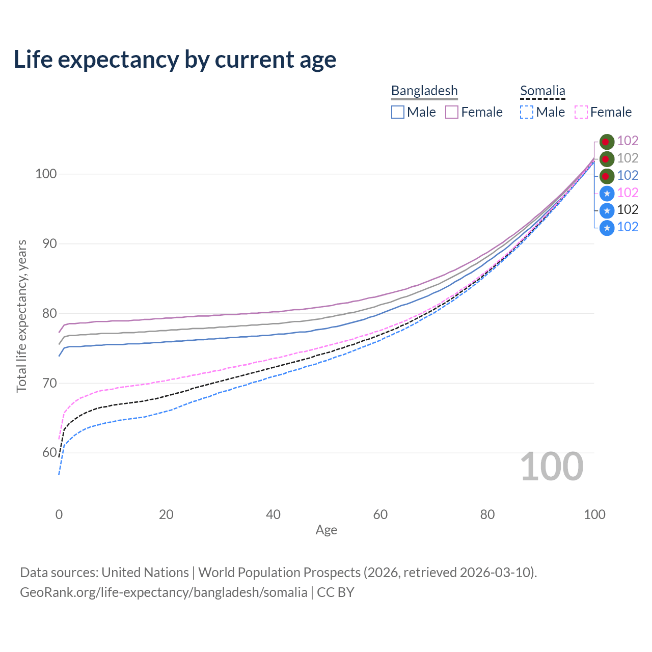 This life expectancy calculator shows the odds of living to 100, 95, 90, and below based on current age for both males and females in Bangladesh and Somalia, along with mean and median age of death. The calculations are based on the 2026 life tables (actuarial tables) from the UN World Population Prospects.