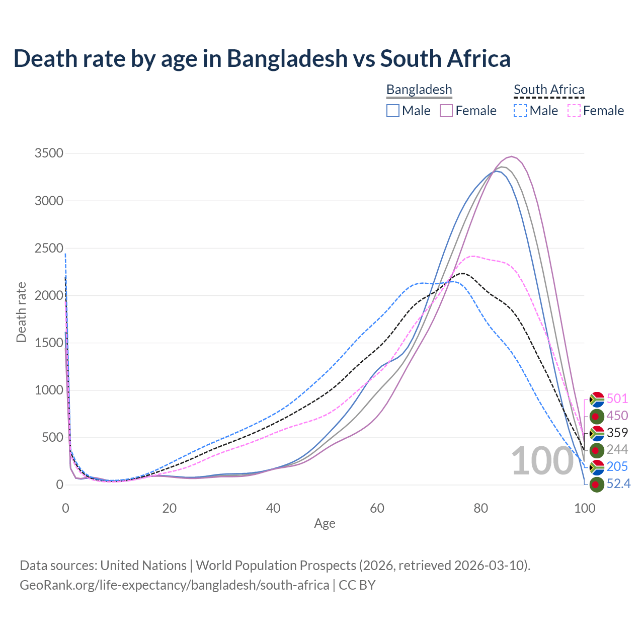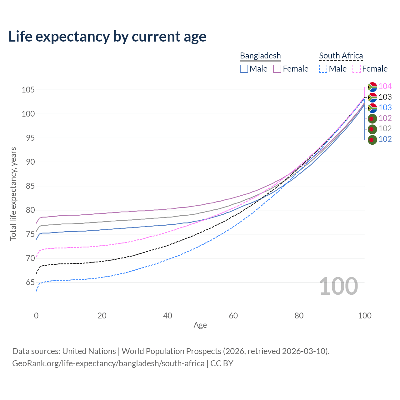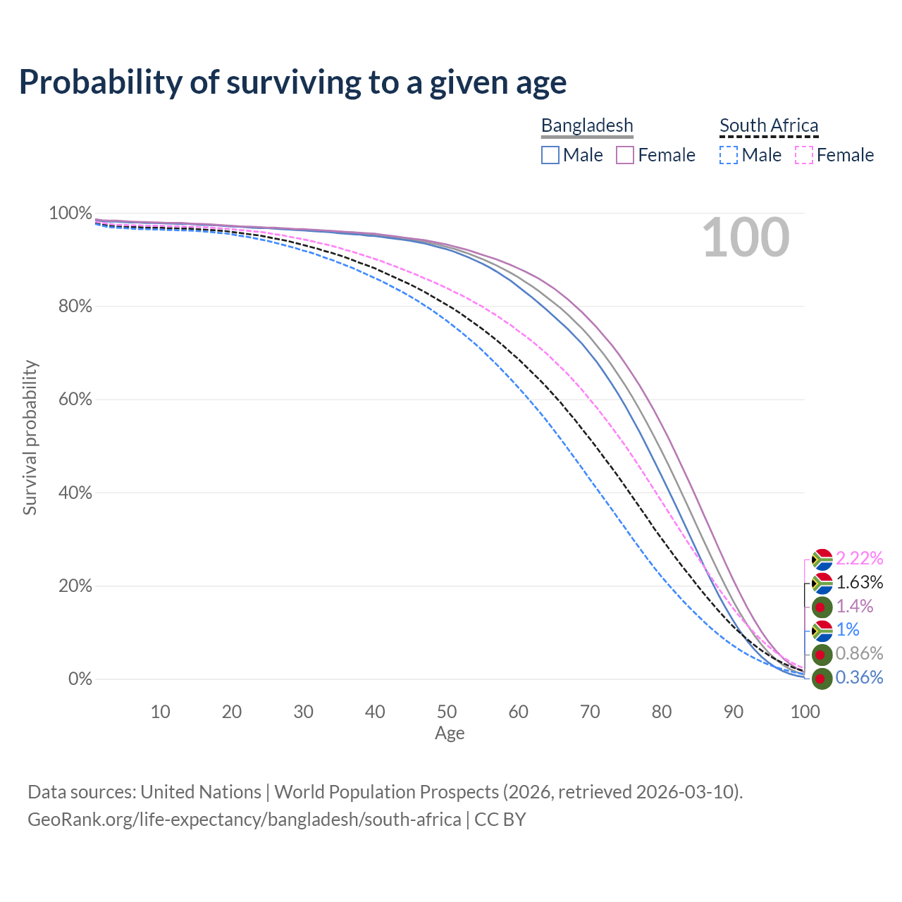 This life expectancy calculator shows the odds of living to 100, 95, 90, and below based on current age for both males and females in Bangladesh and South Africa, along with mean and median age of death. The calculations are based on the 2026 life tables (actuarial tables) from the UN World Population Prospects.